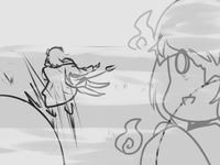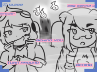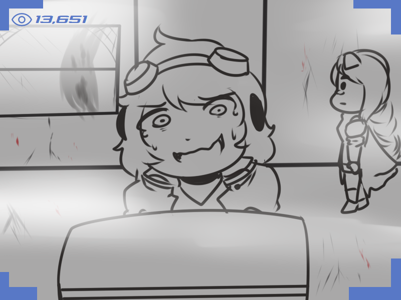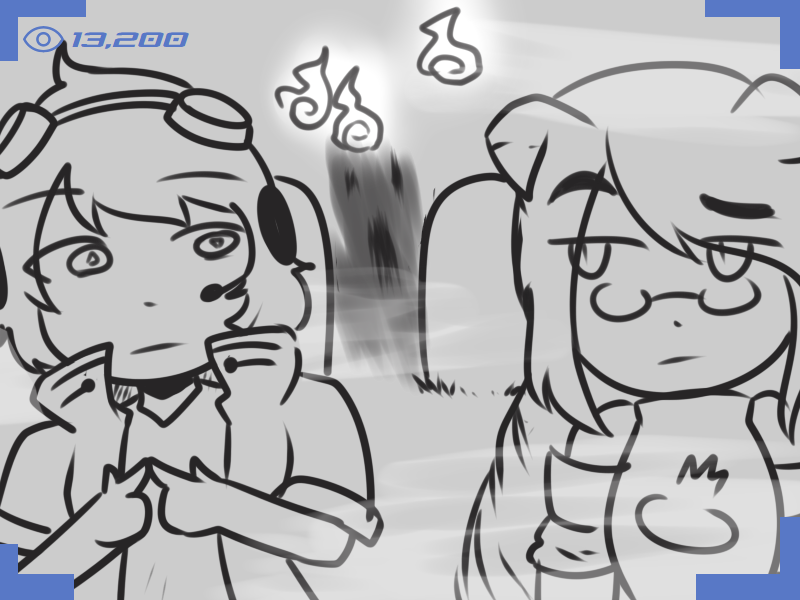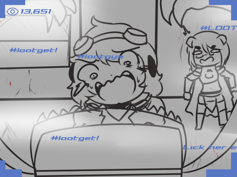 >Ms. Bloops does her usual thing. When finished, Metal Slime can zip in, pick up Ms. Bloops, and sit in view of the camera but running away whenever Arcane turns to see what they’re commenting on.
