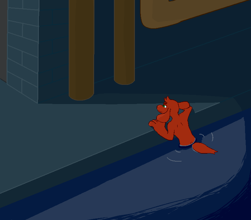 or better yet, if you can hold your breath long enough, dive and hide underwater as long as you can, swim towards the shadows so you’re harder to see underwater, might be better to do that because if you get out to hide, you’ll leave a water trail on the floor leading to you, and then they,ll see your dick!