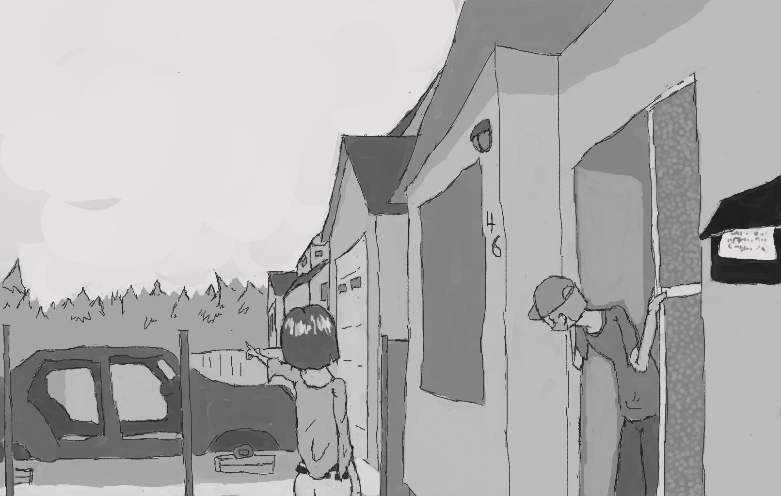 “oh no,” she explains. “There’s no HOA or anything like that, if that’s what you mean. Although that does lead nicely to what I mainly wanted to tell you.” She takes a step back and points to the end of the street, towards the massive forest. “That’s private property and not a public park. I know it’s not properly marked and looks like every other batch of spruce and fir inter-woven in the town, but you need express permission to enter. Besides that, I constantly hear wild animals prowling about and occasionally see the hapless trespasser limp out with bites and gouges. My house is at the end there and to the left, by the way.” She awkwardly tacks that last bit on there.