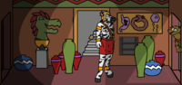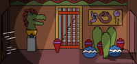 The ladder leads to a really small and uninteresting room… but said room has a simple drape covered door that leads to a much more interesting room! In it, you can see three other portals, probably leading to treasure and adventure, as well as some shelves filled with more of said treasure, and finally a gator guy snoring loudly in the corner. Neat!