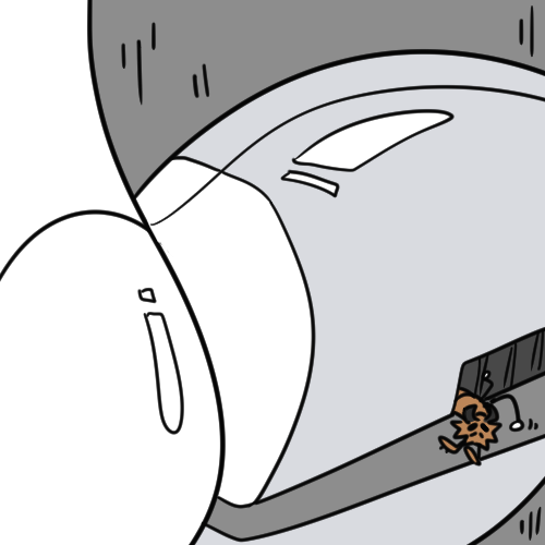 Anet takes the controller and orders the machine to shrink her. An arm rotates to face her and sprays a large blue cloud in an up and down pattern. For a moment, she’s still standing inside the cloud as it spreads to cover her legs, and then she appears to vanish as the cloud disperses. Of course, she’s not gone, she’s just standing at our feet, now the most miniscule ant to ever exist. She’s jumping and waving up at us, though we’re already looking right at her. I kneel down to get closer, trying not to speak too loud. “All good down there?”