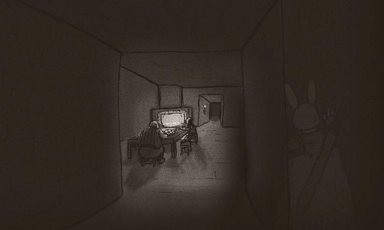 Traversing the dim passageway, you reach the corner where the path turns before quietly positioning yourself to have a look. Beyond, a broad hearth crackles with flames sending smoke up through a chimney into the stone. A foul stench assails your nose -- a tang of blood and something moldering. It takes a few moments for your eyes to adjust to the new lighting before you can make out two figures that you can see.