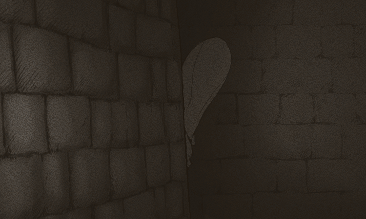 From your position you can't make out the right half of the room without rounding the corner and drawing much closer. On the opposite end of the chamber, a passageway with an ensconced torch leads off to a darker room; there, according to Conrad's description, were torture implements and other paraphernalia.