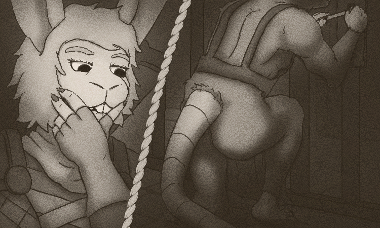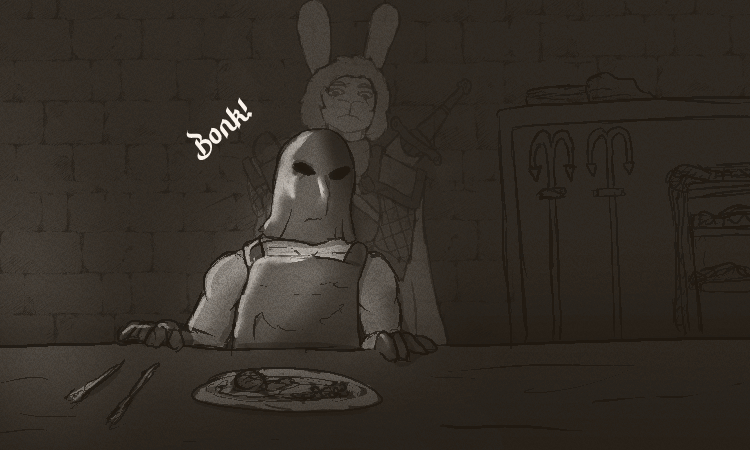 Most noticeable is a huge, broad man with a bald pate and a thick, muscular neck and limbs on a heavy frame, seated with his back towards you as he leans over a table. From what you can make out, he seems to be in the midst of eating some manner of meat, cutting at it periodically with a large hooked knife. Seated further down the table is a second man, far more lean; there is no plate before him as he sits in still silence, a black hood drawn over his head.