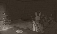 Given Conrad's famished state, you favor the man with one of your trail rations, along with a leftover baked good and one of your daggers, to arm and feed him. As he eats, you prod Geoffrey for potential garb. "I'm a lot bigger than he is, but..." Geoffrey appraises, but rummages in his stowed gear and pulls free a long linen shirt. "Enough to cover you at least."