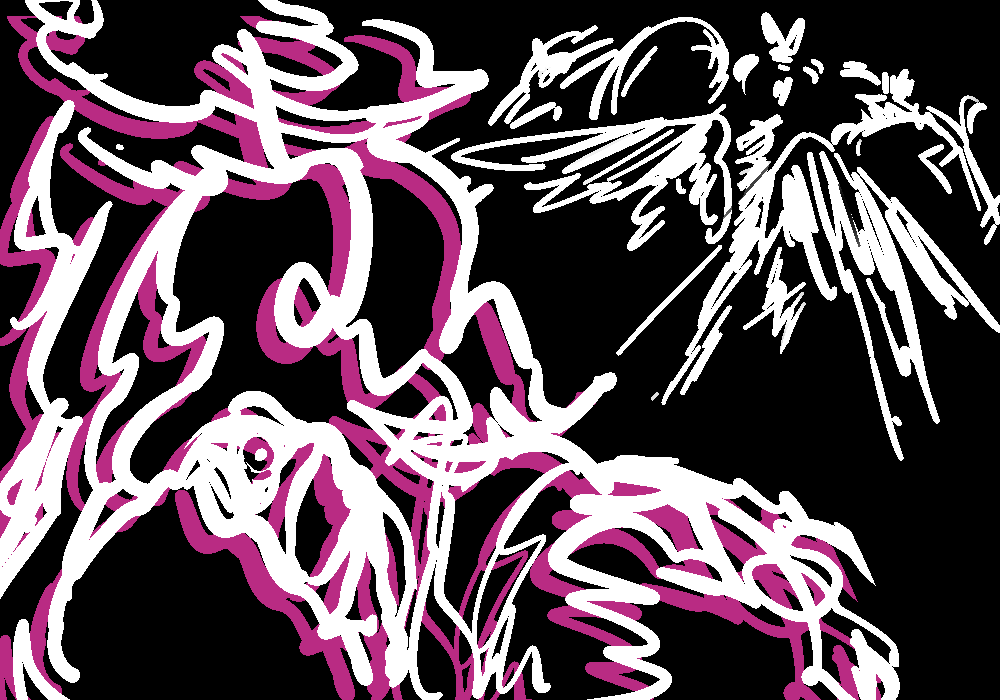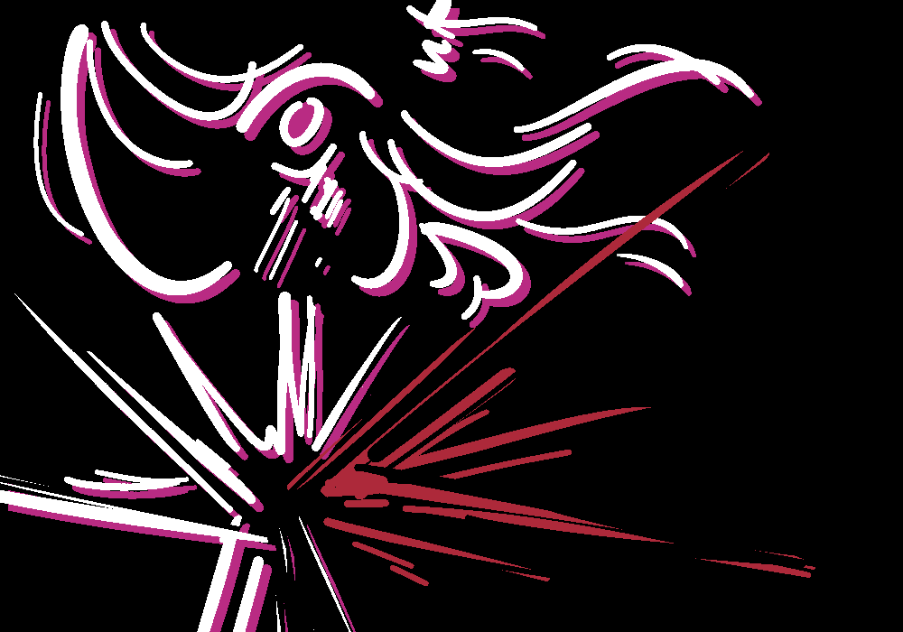 Images pulse around her. Visual noise that dances along the yells and gunfire. Outlines and shadows envelop her eyes, an animation keyed frame by frame along its smears. Indecipherable, until it comes all at once.