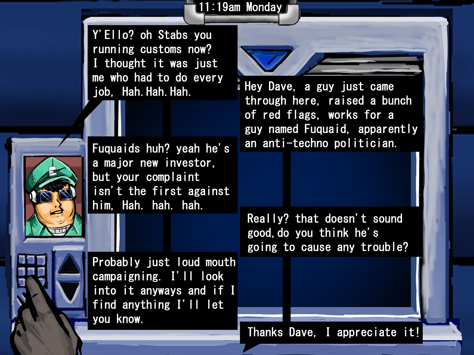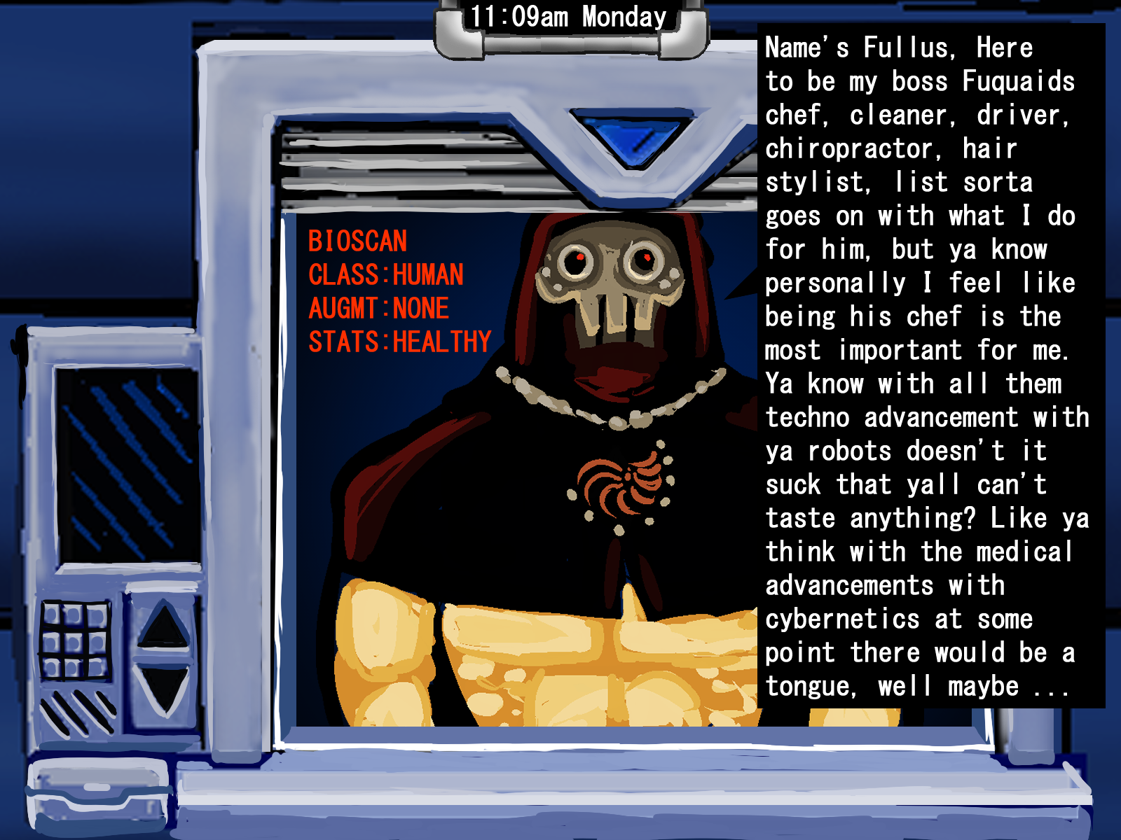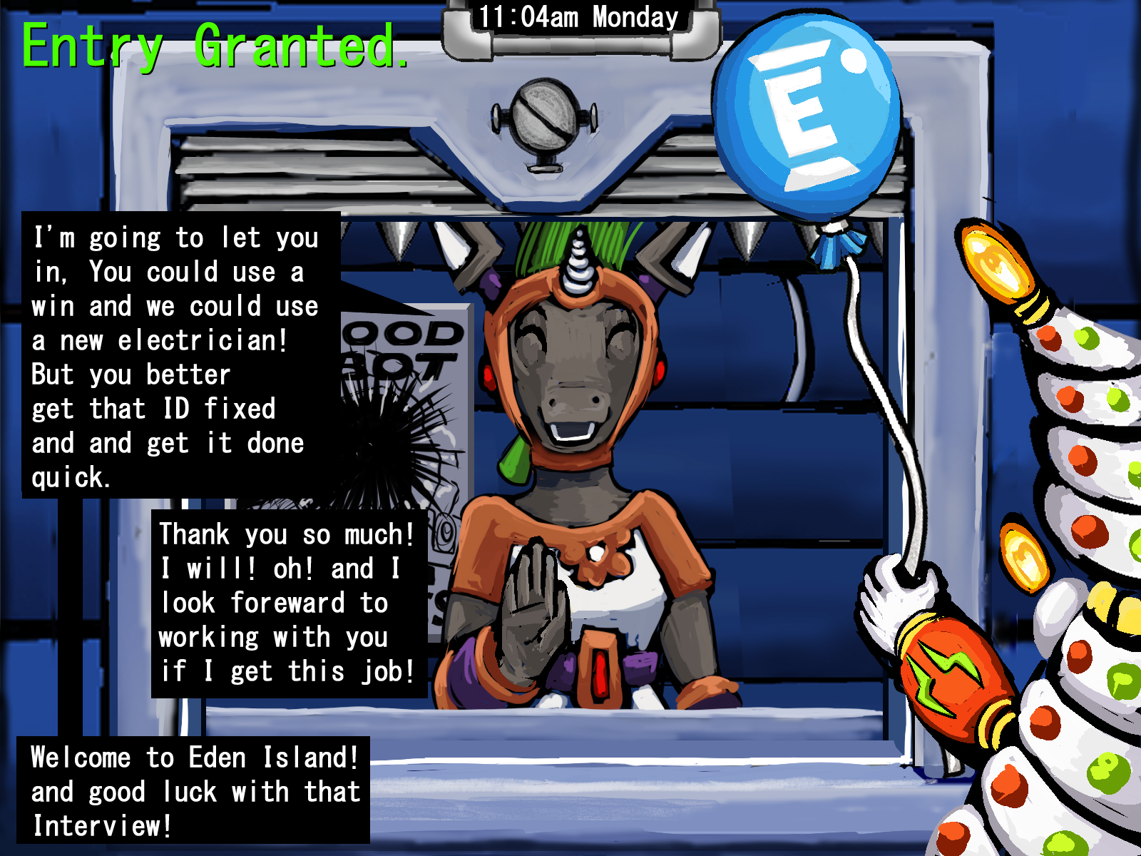 "Thank you! My name's Stabitha, and I know who you are. Big fan of your work! What was that about your ID and room number? I'm the border guard, it's my job to collect ID cards and inspect them, and I haven't received any in advance."