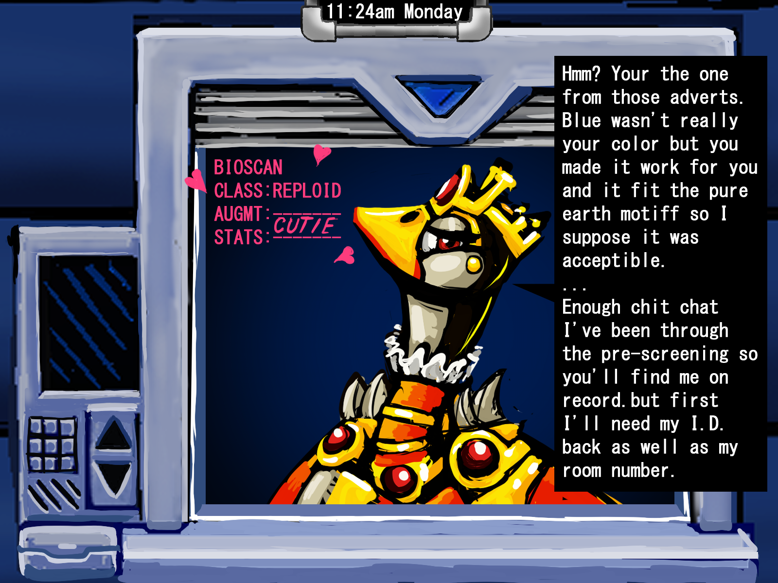 Well, this day just got a whole lot brighter (and shinier)! Not only is the next entrant another reploid, but she's the famous Gilded Goose here to meet us in person! Or an impostor trying to exploit her fame to bluff her way past security. A Maverick Hunter can't afford to let her admiration get in the way of investigating a potential Maverick.
