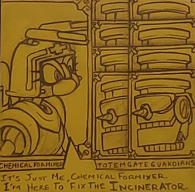 Chemical Formixer addresses the Totem Gate Guardians, “It's just me, Chemical Formixer. I'm here to fix the incinerator.”