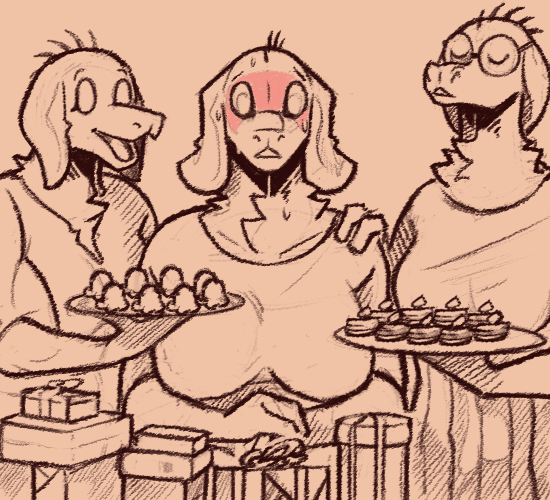 A group of familiar faces clap their hands. There’s over a dozen present! Decorations are strewn about and plenty of food on the concession table.