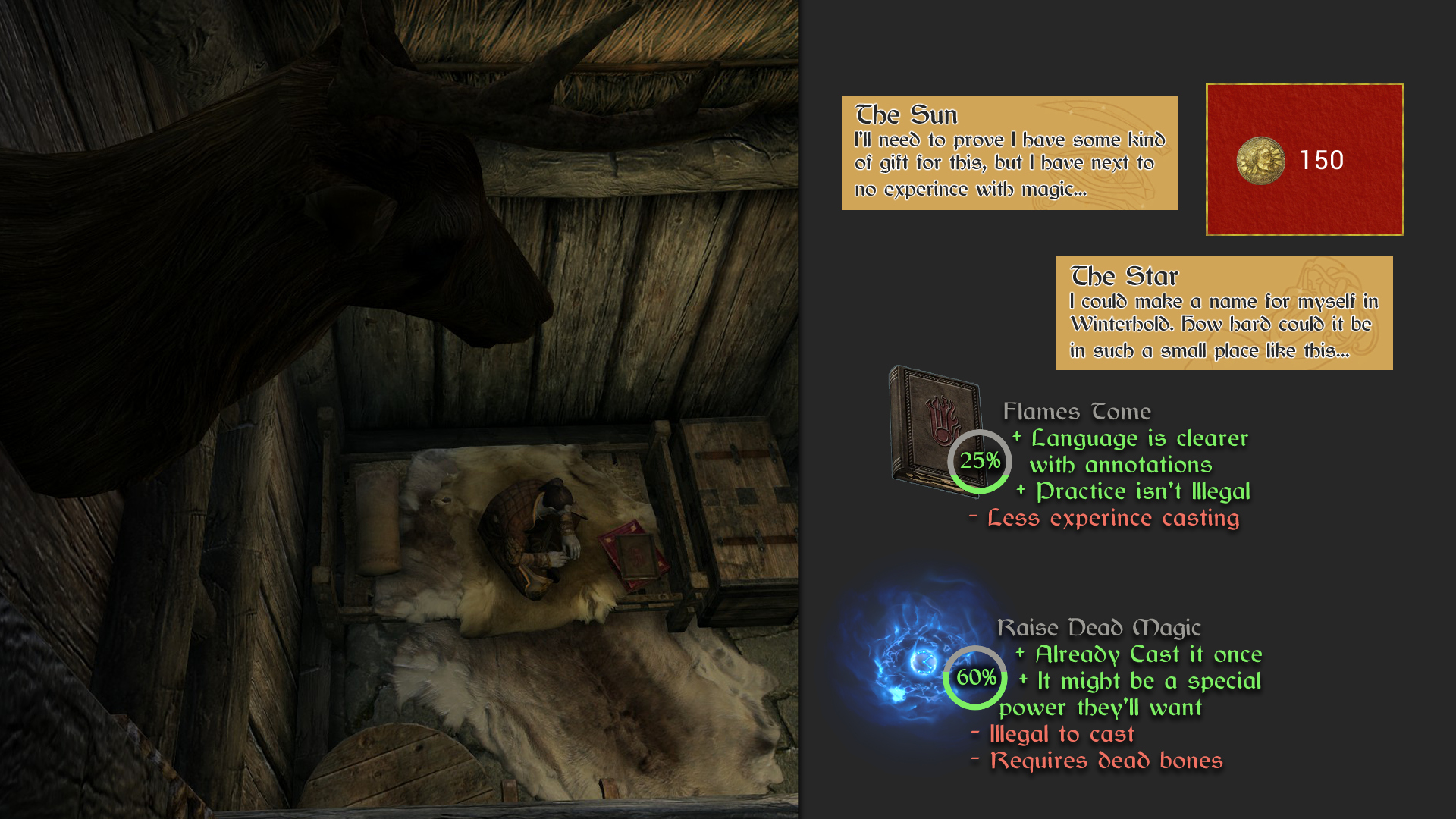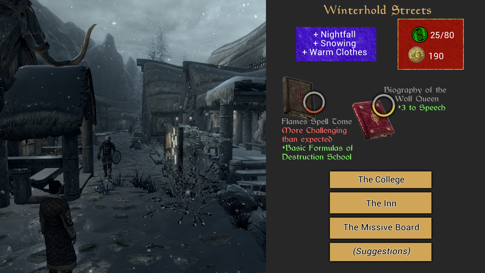 “Recover the lost heritage of Winterhold. Return Skyrim to the Nords. Join the Stormcloak Rebellion.” There are simple woodblock prints inspired by ancient geometric shapes found in Windhelm’s architecture. I just left Windhelm, and I had more loyatly to Skyrim than to the Empire.