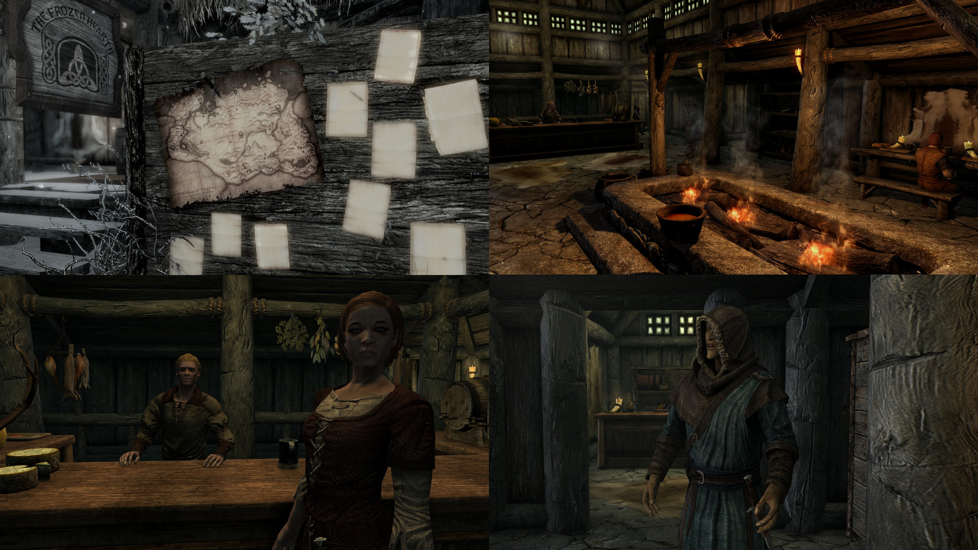 The Frozen Hearth. Quaint was a little too nice to describe the state of the inn. The property itself was large, but the construction was nearly ancient. Worn stone floors and creaking support beams. Lumpy, stinky beds, squeaky, uncomfortable seats, and stained, knife pocked tables. There were a few shadowed corners though, worthy to sit in and read. Whatever food was cooking smelled good as well, some form of stew. There was a tall elf wearing vibrant robe. He seemed to have his own room, filled with books. As I entered, he was speaking to a man at the counter. "I'm sorry, could you describe the smell?" He asked.