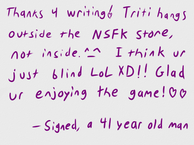 Oh, it's a letter from one of the game devs! Turns out I made a mistake in the last thread, and Triti was not, in fact, cut content.