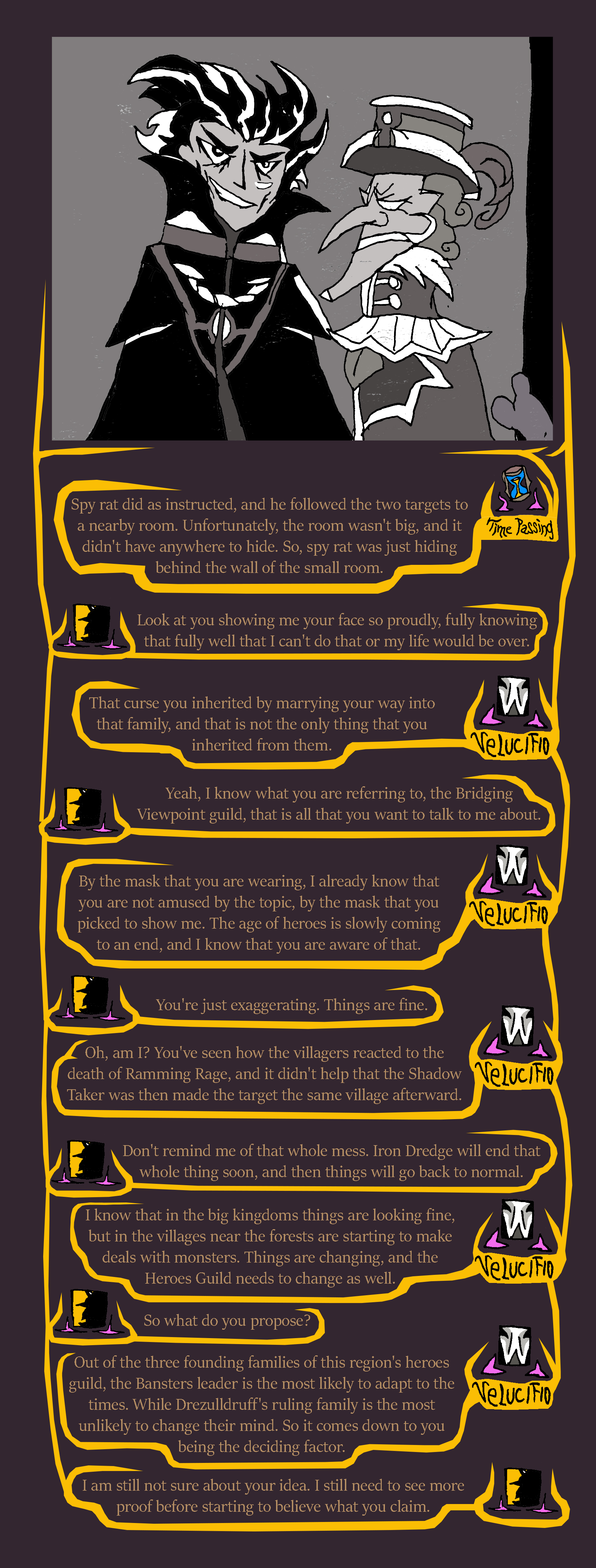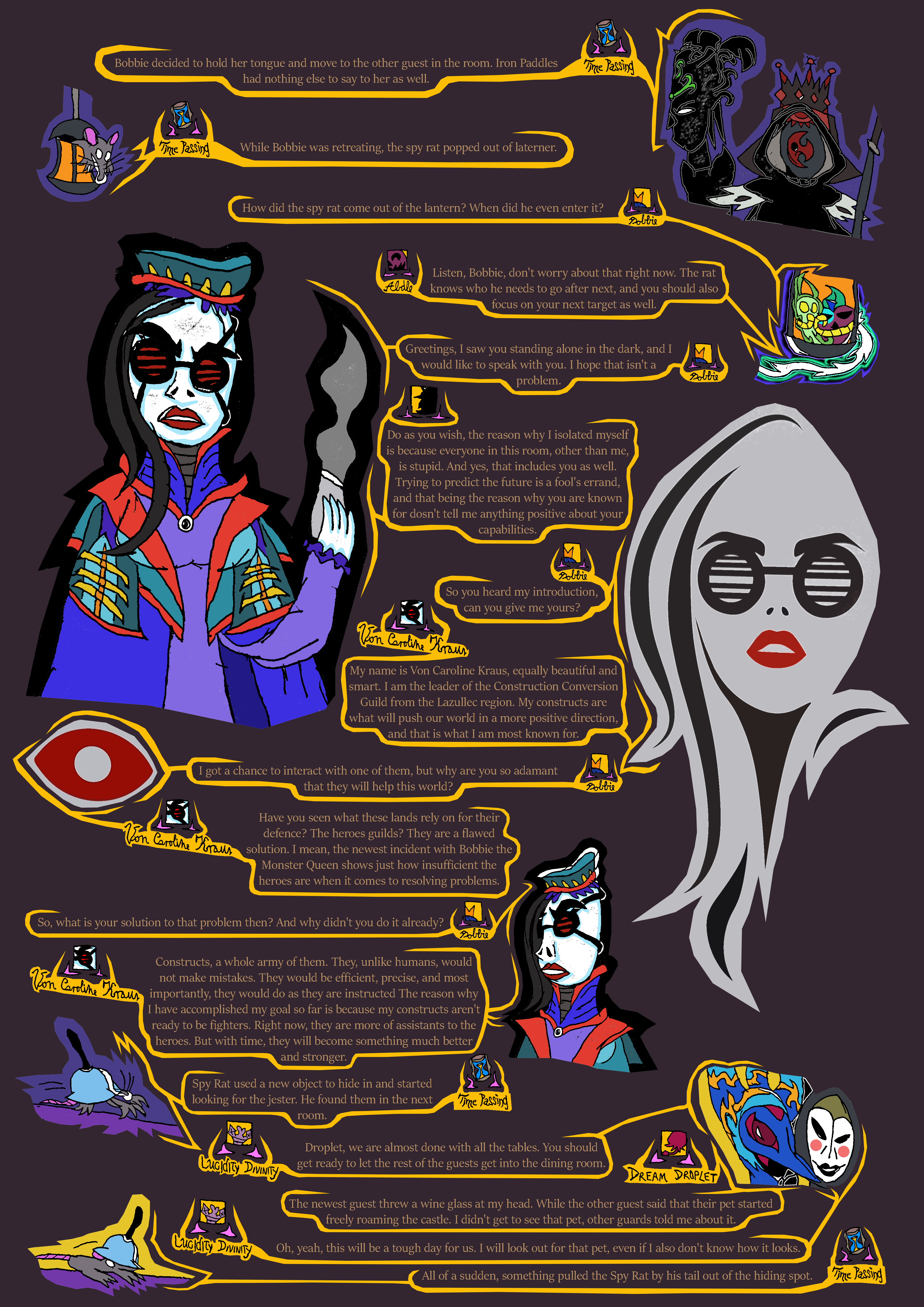 lastly, that was the second time today that spy rat got caught. We need to have a serious talk with Ratislav about training his rat spies, otherwise they could get caught and eaten. With that in mind, I think we shouldn't let spy rat back out right away until after Maya Din is done talking with us, and when the performance begins since that is starting soon. People will be distracted during that time to notice the rat.