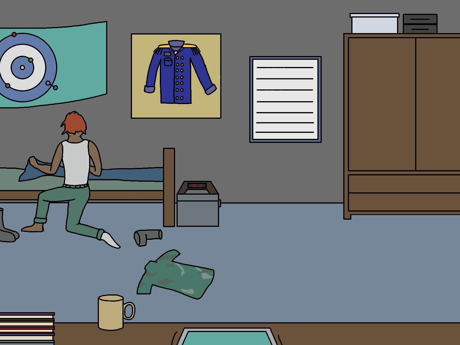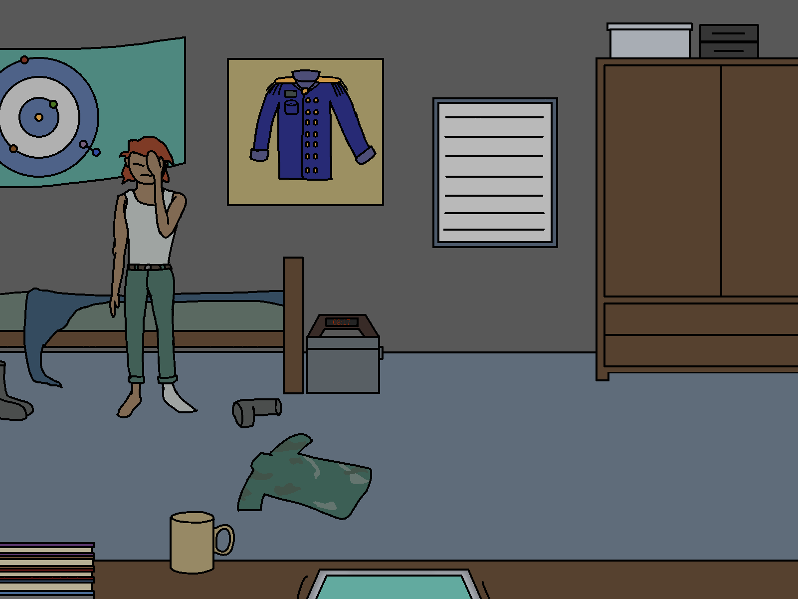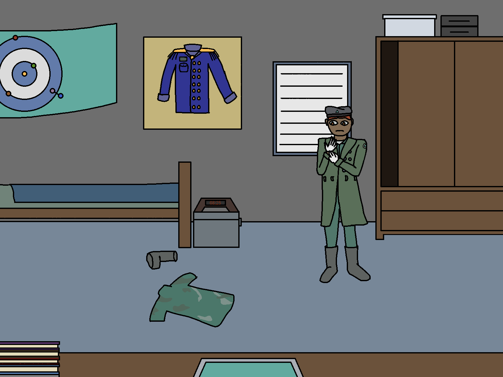 Ah… that’s the formalwear for officers, used for celebrations and the sort. I only got to use it like once or twice, last time was yesterday, on the graduation ceremony. Soon after, I came back here to change to my backup uniform, because I knew I was going to get trashed in the… “after party”. I didn’t want it to get stained. I still needed to get the rest of the uniform framed, but I liked the top more... a Shame I don't get to use it that often.