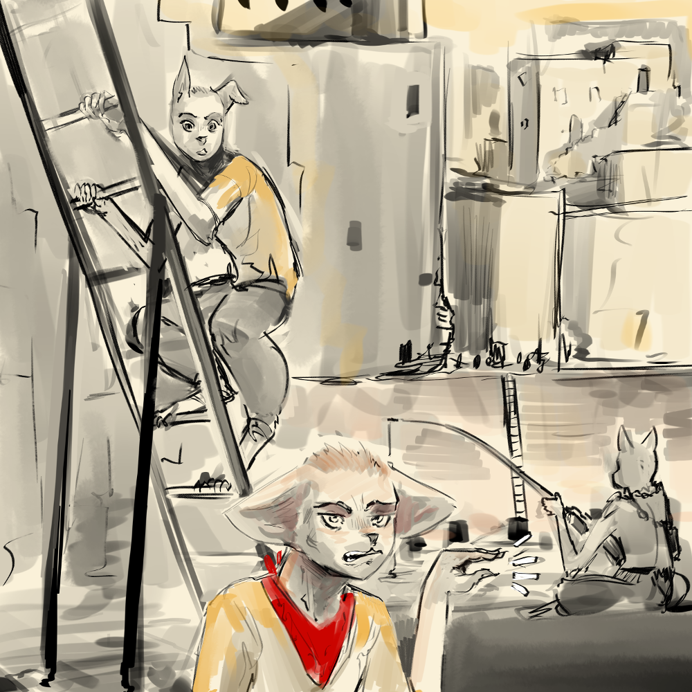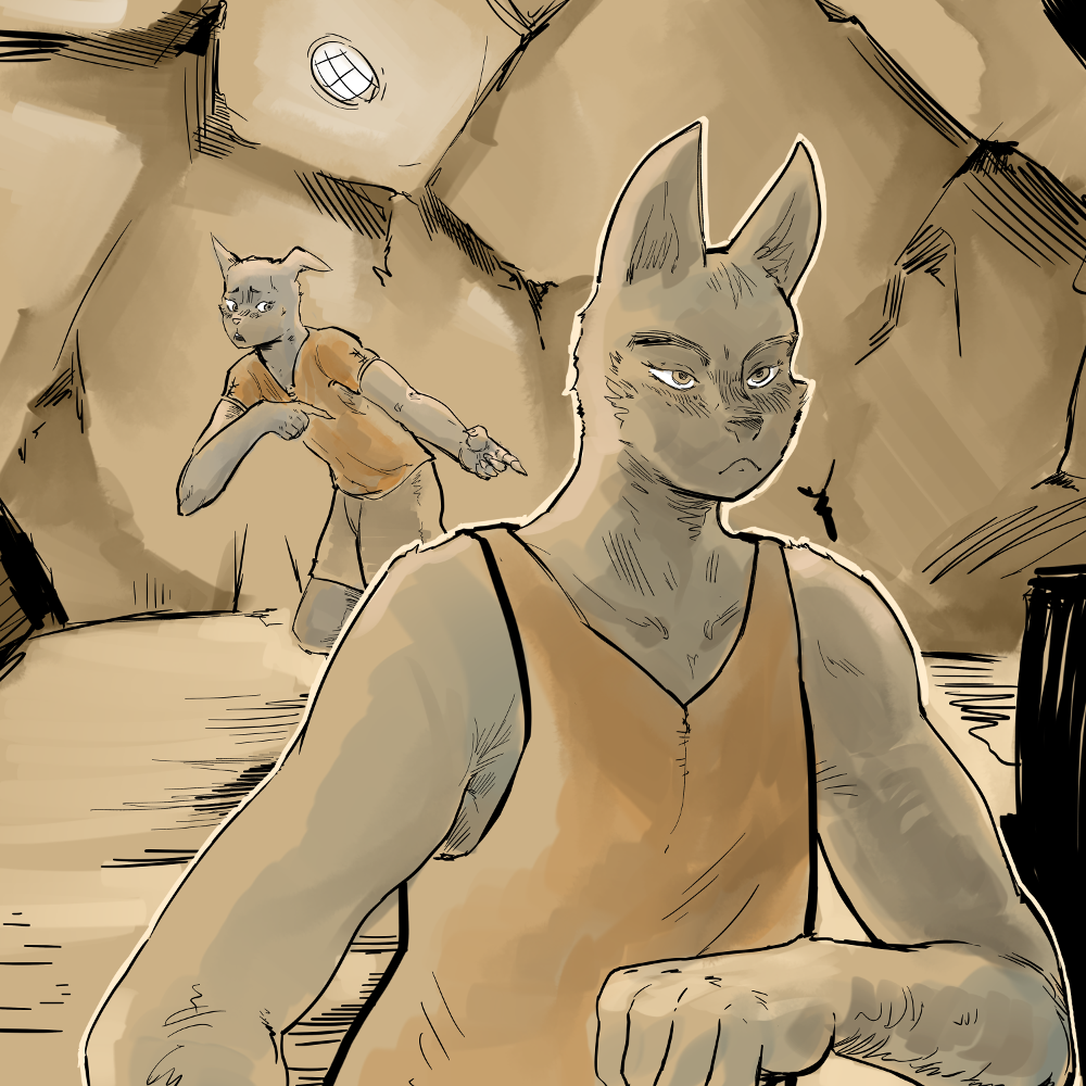 “Nah, see,” He waves my words away. “I found this perfect spot to watch from without no Tats or Lanks to get in the way. I just don’t got the muscles to get there, so I need your help. I’ll lend you a hand later, I promise! Ain’t I good for it?”