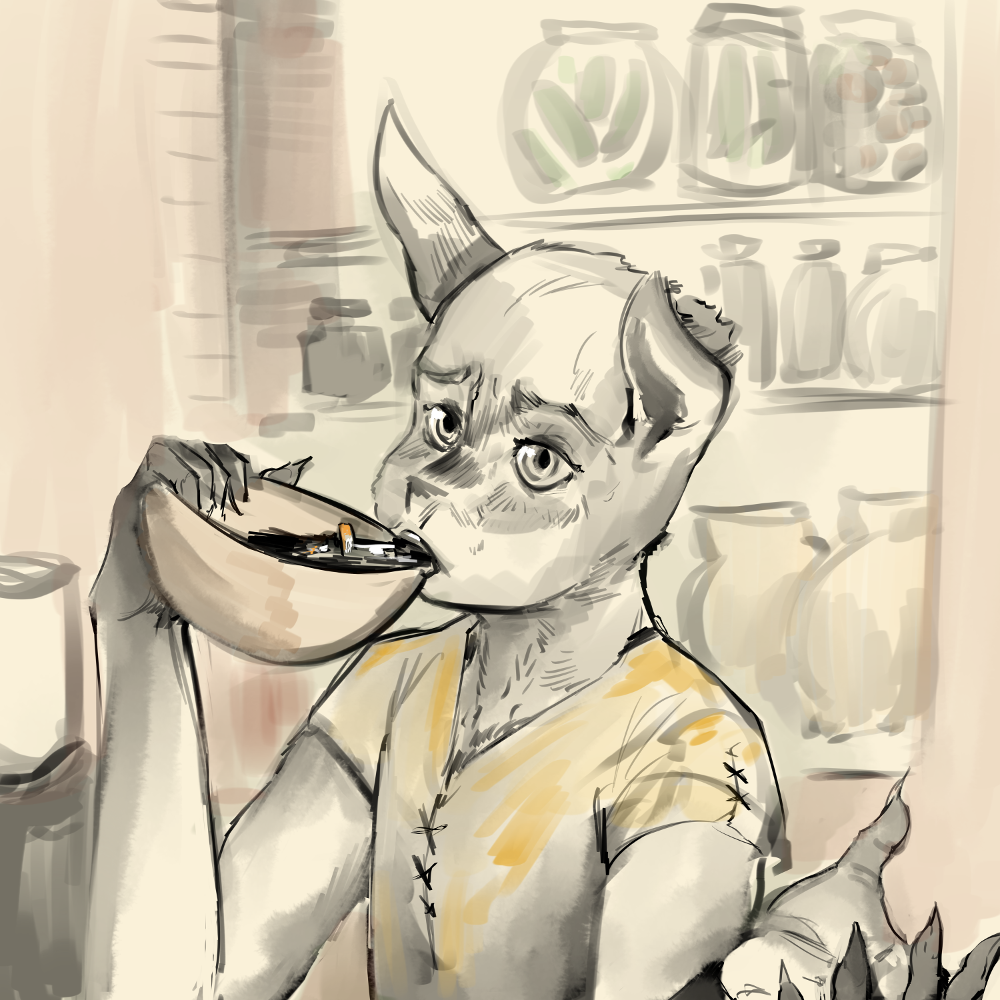 “Then go yourself and lemme get on in peace. I have to finish peeling before dinner.” Fingers gives a little snort.