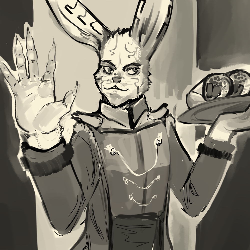 “No, no. Belay that.” He interjects. “I am the one who should apologize for getting away from myself. I am not here for fun, in the end.” He runs his hands across his silver badge. “I may be in need of a small break. If one of your nykin could take me to my room so I can freshen up, we can continue our talks a bit later.”