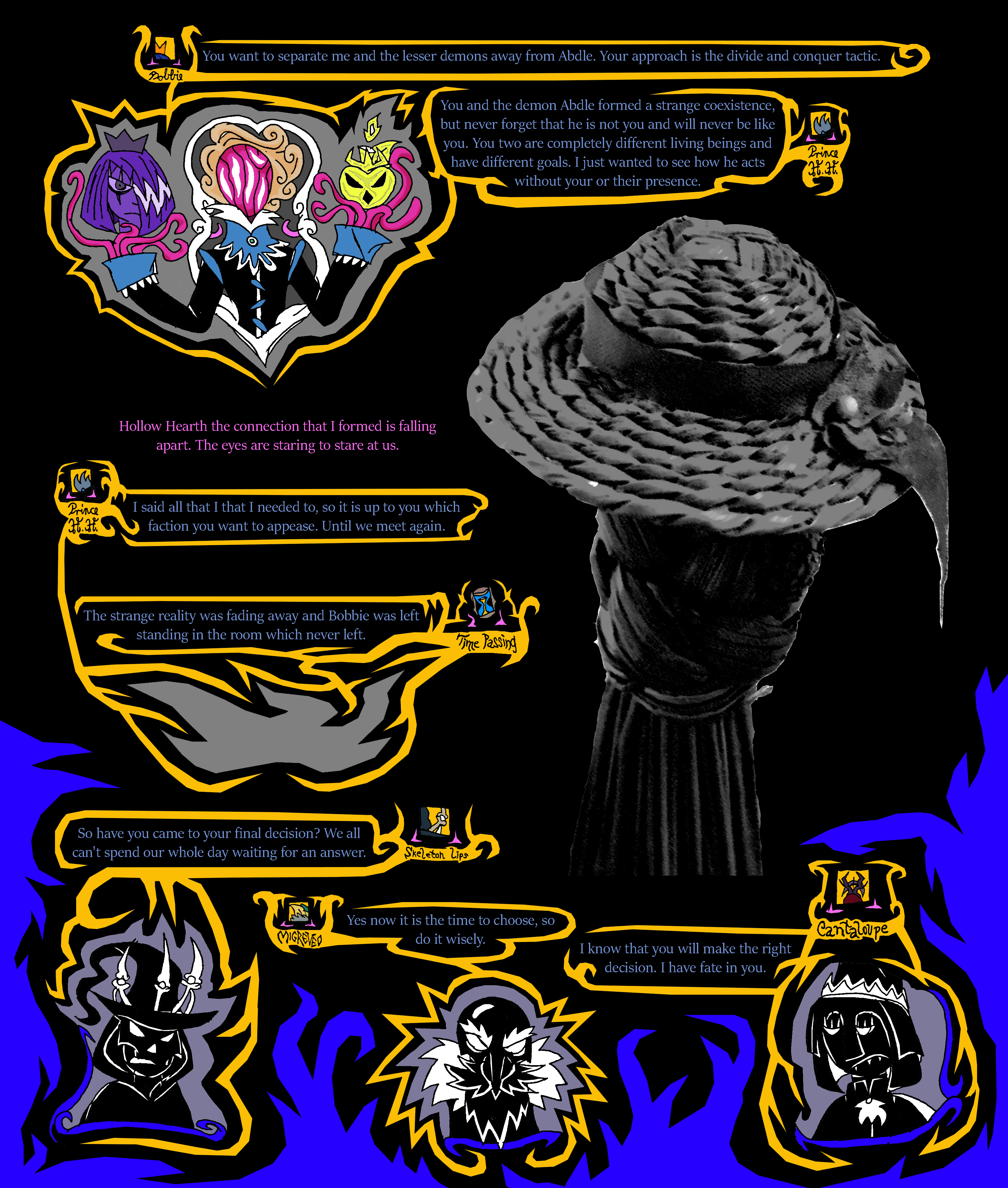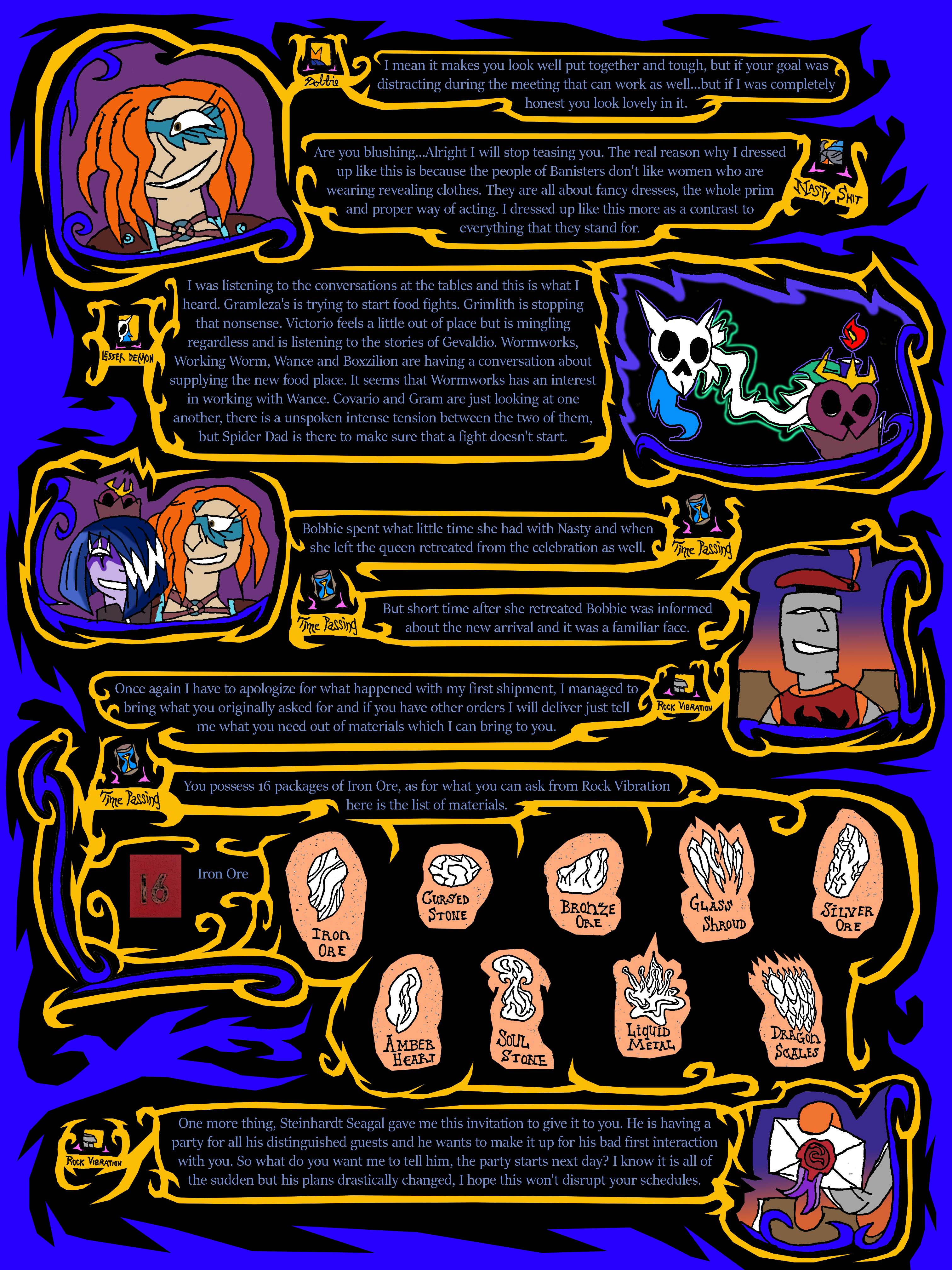 Oh right, Abdle, you'll have to be the one to invite Skeleton Lips instead of Bobbie. Skeleton Lips is a bit angry and Bobbie, and Bobbie isn't too happy with her as well. I think Abdle being the one to personally invite her himself would be kind of a way to get things relatively back on track on keeping things peaceful since he could be seen as neutral not taking any choices, and Bobbie's invite might not sound genuine if she's still a bit annoyed with skeleton lips. Any talking with Skeleton Lips will be with Abdle