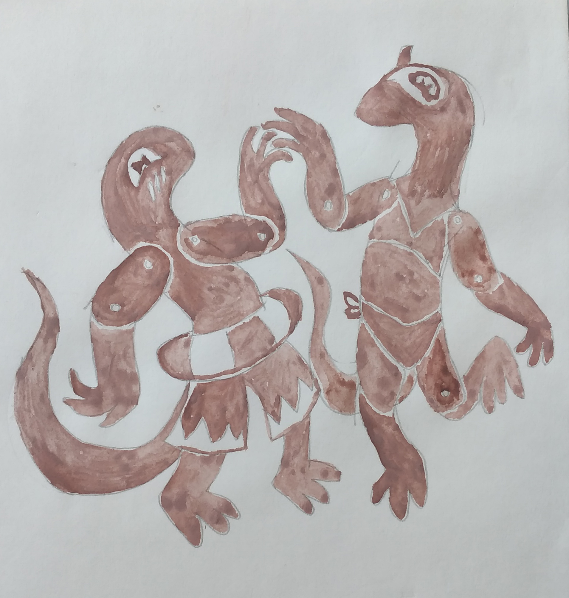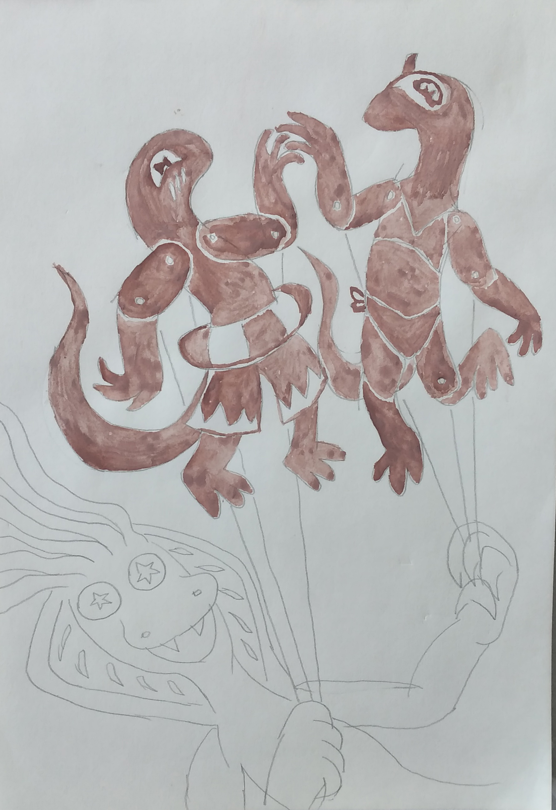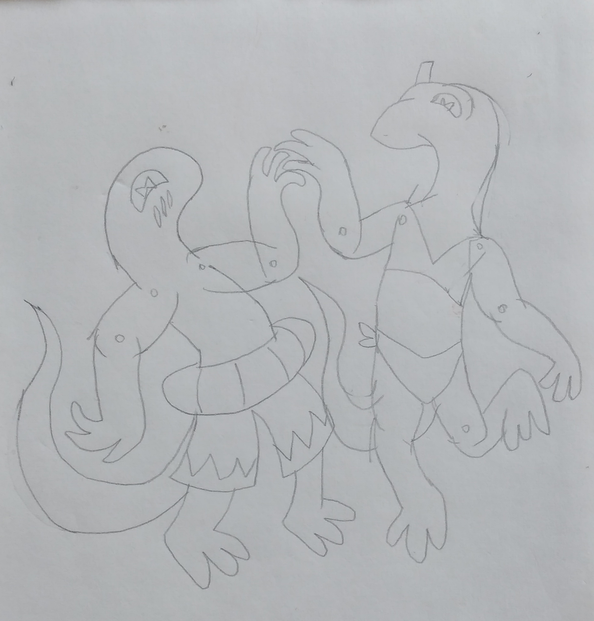 Essence: "Sure, the artist started to do sketch of the two lizard looking creatures."