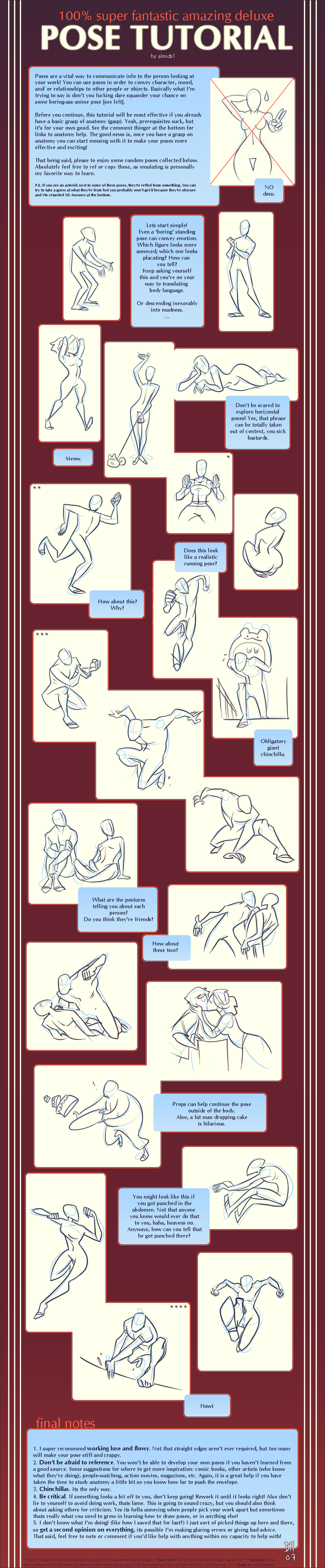 19.) Don’t be an asshole when critiquing: There is a difference between critiquing someone because you want to help them and being an asshole. Unless someone specifically ASKS you to tear their work apart, be polite, be positive, and be encouraging. Point out flaws as well as success so the artist knows both what they did right and wrong. Be careful when criticizing stylistic choices because those ARE opinion based whereas assessments of technical issues are not.