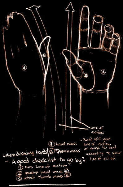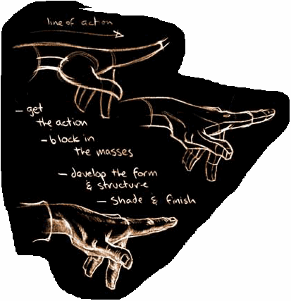 24.) Fur and cloth: Fur will follow the directionality of form. Don't just draw a bunch of furry strokes going in whatever direction. Cloth will also tend to react to the form beneath it but it is furthermore being acted on by gravity to various degrees, depending on the type of cloth. When inventing cloth folds, try to imagine how the cloth would react to form and gravity.