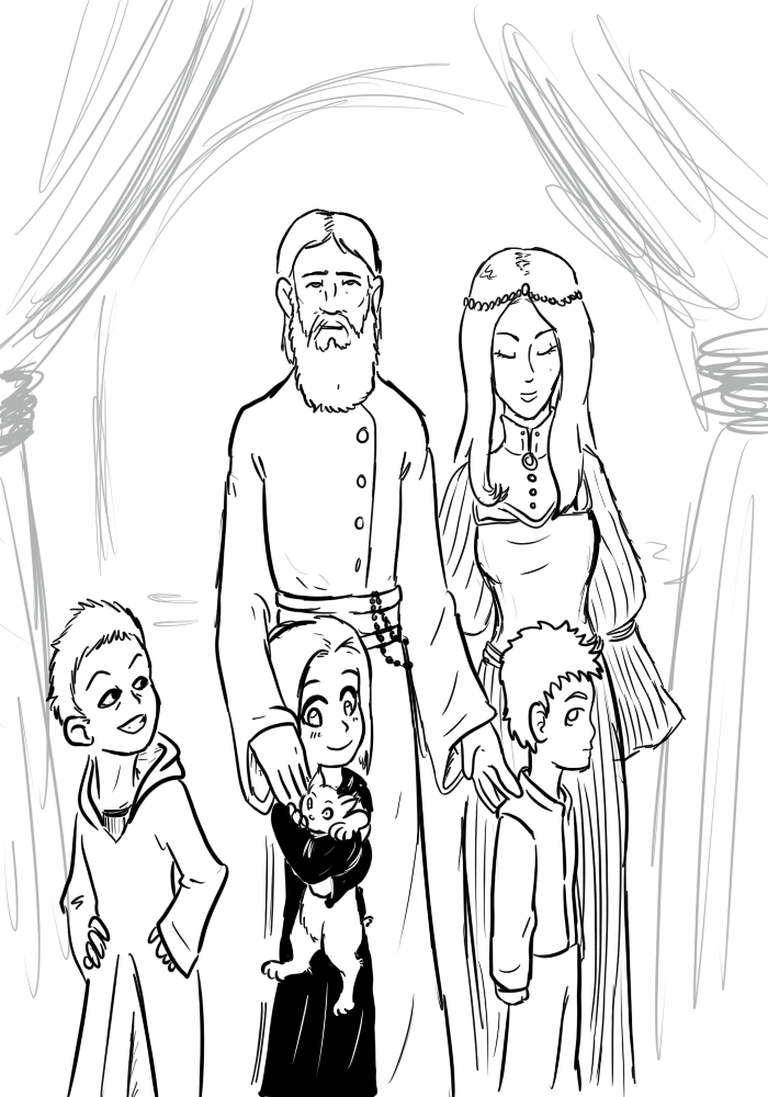 A small boy, no older than five years old, in dark red robes. He has sort of a cocksure smile on his face. Next to him is a small girl, same age, in extremely black robes. She holds a lynx kitten in her hands. A man who looks very much like Rasputin, in black robes with a hand on his daughter's shoulder. He stands with a face of determination, with a tiny smile of satisfaction on his face. He has his hand on his adoptive son's shoulder. This child shouldn't look much like the others, since he is not related to them. He'll have red hair which no one else in the family has. Then next to him is Christina, Vasily's wife(A very good Role-Player and friend). She wears an expertly, incredibly tailored dress. She has the Major Beauty gift in the system, so do try to make her beautiful.