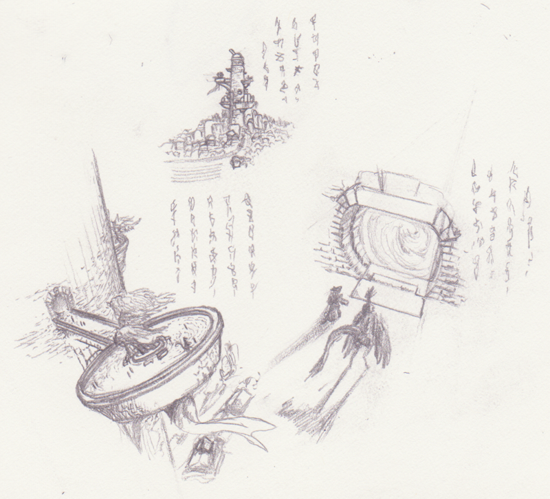 "The university cities of the free Ploverlor are truly a sight to behold! The city of Teeravane in particular. While all the university cities tend to be built around the central magic university, Teeravane’s stands out above the rest, quite literally. Built within a massive tower, restored from a ruin discovered from ancient times, the magic university is one of the greatest and most prestigious in the civilized world. Looming far above the city below, some of the most amazing breakthroughs in magic research were discovered within those ancient walls. The terraces that dot the outer levels of tower sport gorgeous gardens allowing magic researchers and students the ability to relax and experience nature without even needing to leave the campus grounds. I certainly enjoyed the familiar feeling of standing in the winds on of the terraces during my tour. Perhaps one of the most incredible features of the tower is located deep within the basement. The wizards of the university told me of some manner of anomaly that they discovered in the ruin’s depth. They tell me that they’ve managed to stabilize it and even utilize it! The anomaly is a sort of portal that can be used to transport objects over great distances instantaneously! But they tell me it’s not safe yet to transport organic material like people. They wouldn’t actually let me see the basement, but I drew a little picture of myself seeing what I assume it’d look like anyway, because they can’t stop me."