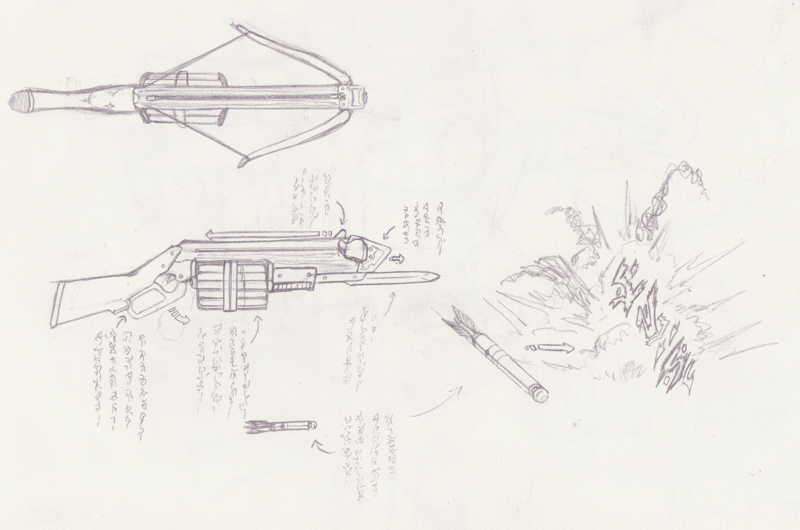Patrol team members carry with them a melee weapon they’re familiar with, such as a sword, mace, etc, and one member of a team is usually issued a Grenadier Auto-Crossbow. This weapon was originally designed by an engsami engineer named Khaelid Mudaeni. The crossbow has a lever action that rotates a drum magazine and feeds a bolt into an upper chamber, as well as automatically drawing back the bow. The ammo drum can be loaded with standard bolts and is designed to be swapped out with a new drum when its ammo is depleted. But that’s not the most impressive part of this weapon.