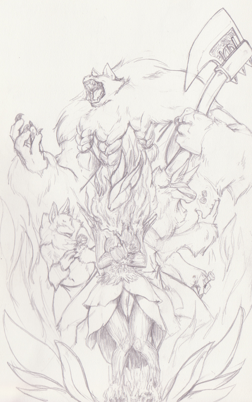 All three societies also appear to share a common religion which I’ll go into more detail about elsewhere in this book. However, I will mention that a common practice among all of the Lazurek villages I visited was a ritualistic cremation of their dead. When a member of their tribe nears the end of their life, they rested upon a bed of flowers. I am told this is symbolic of their perceived after-life; that being, an endless garden where they are reunited with their loved ones, and live along side their patron deity and Nalos, their goddess of fire and nature. The smell of flowers seems to soothe the mind of those at death’s door. Once the afflicted have passed, their are ceremoniously immolated, and their ashes given to their next of kin to be tended to. While attending one of these ceremonies, I observed that, while Lazurek cannot cry, lacking eyes and therefor tear ducts, they express sorrow through a mournful howl, which is morbidly beautiful in concert with one another. This cremation practice also makes it very hard to obtain a skeleton for study. I had to seek out a Hat’kal for the skull samples used for these sketches. He refused to divulge where he obtained them though.