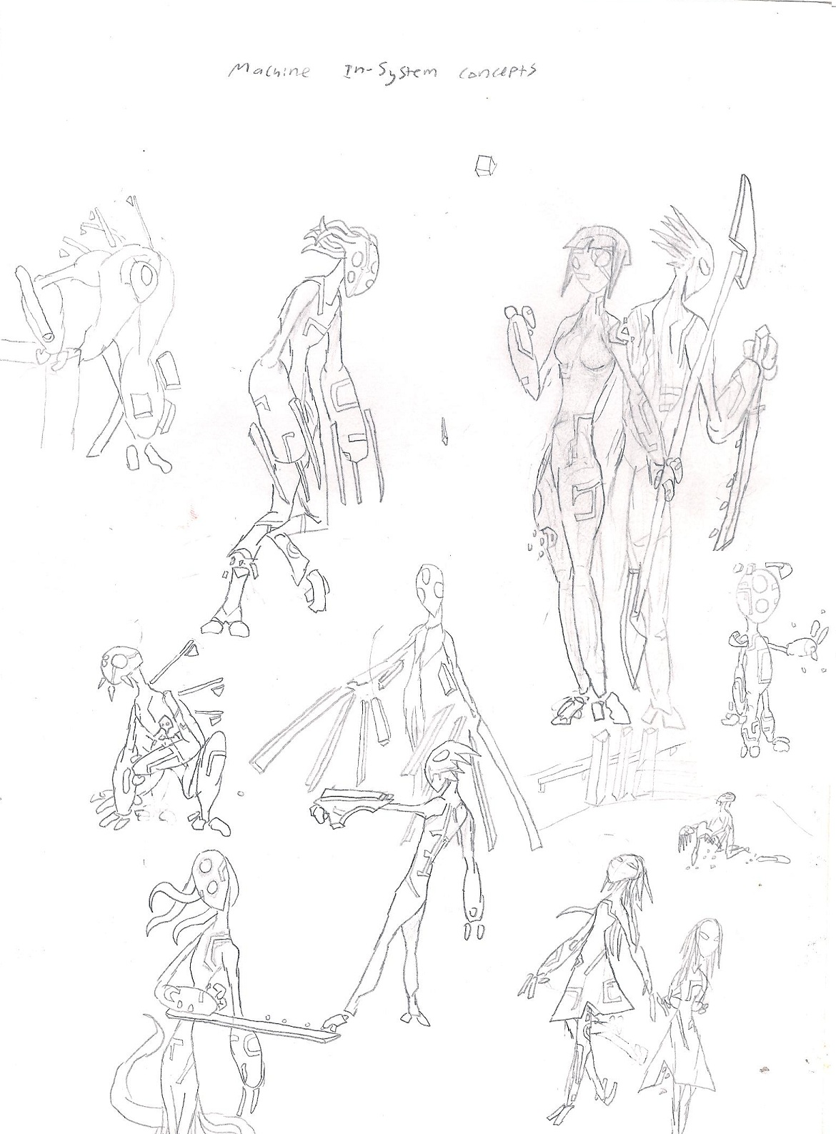 To sum it, up, its a re-working of the Terminator future, with 9 and Wall-E thrown in. Started as a video game concept, still is that, but focusing on setting right now.