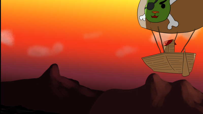 Captain Kitty Pirate of the SS Adventure Meowy sails towards the far mountains on the horizon, accompanied by his weary crew of whiskered compatriots after a long day of pillaging.