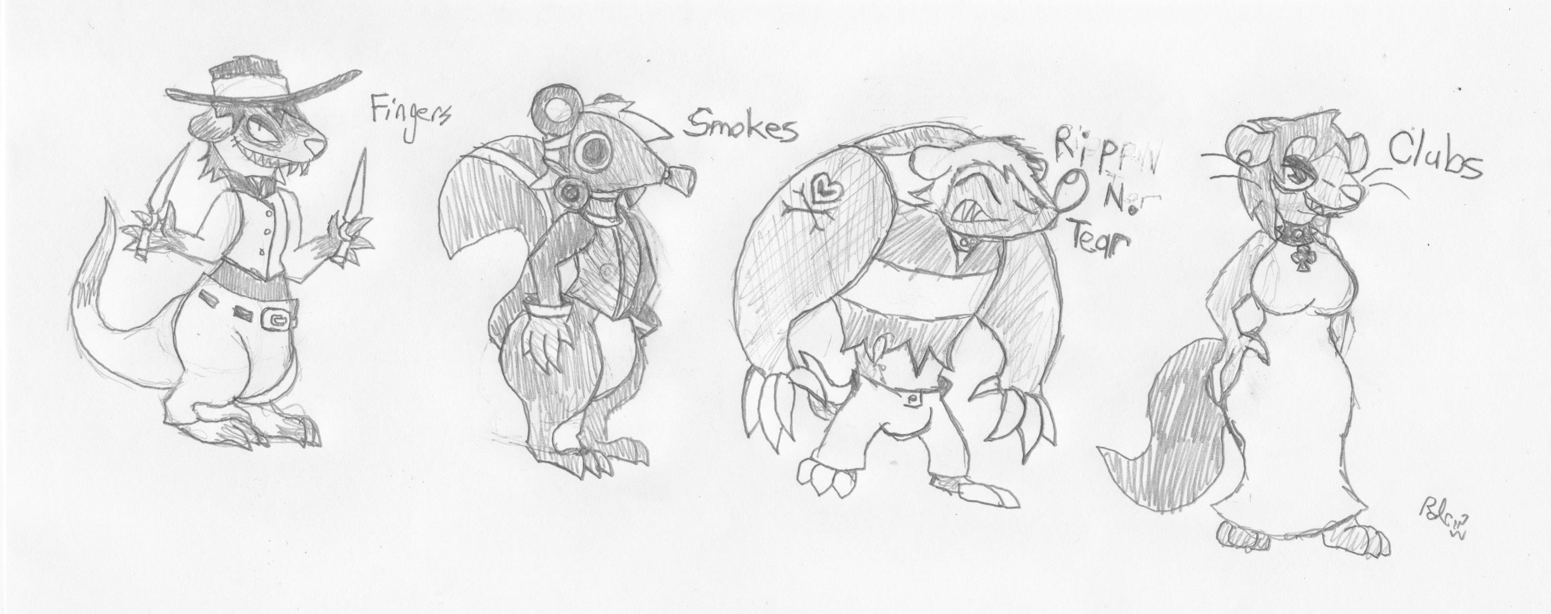 Mustelid cartoon mobsters, part of a gang lead by a weasel.