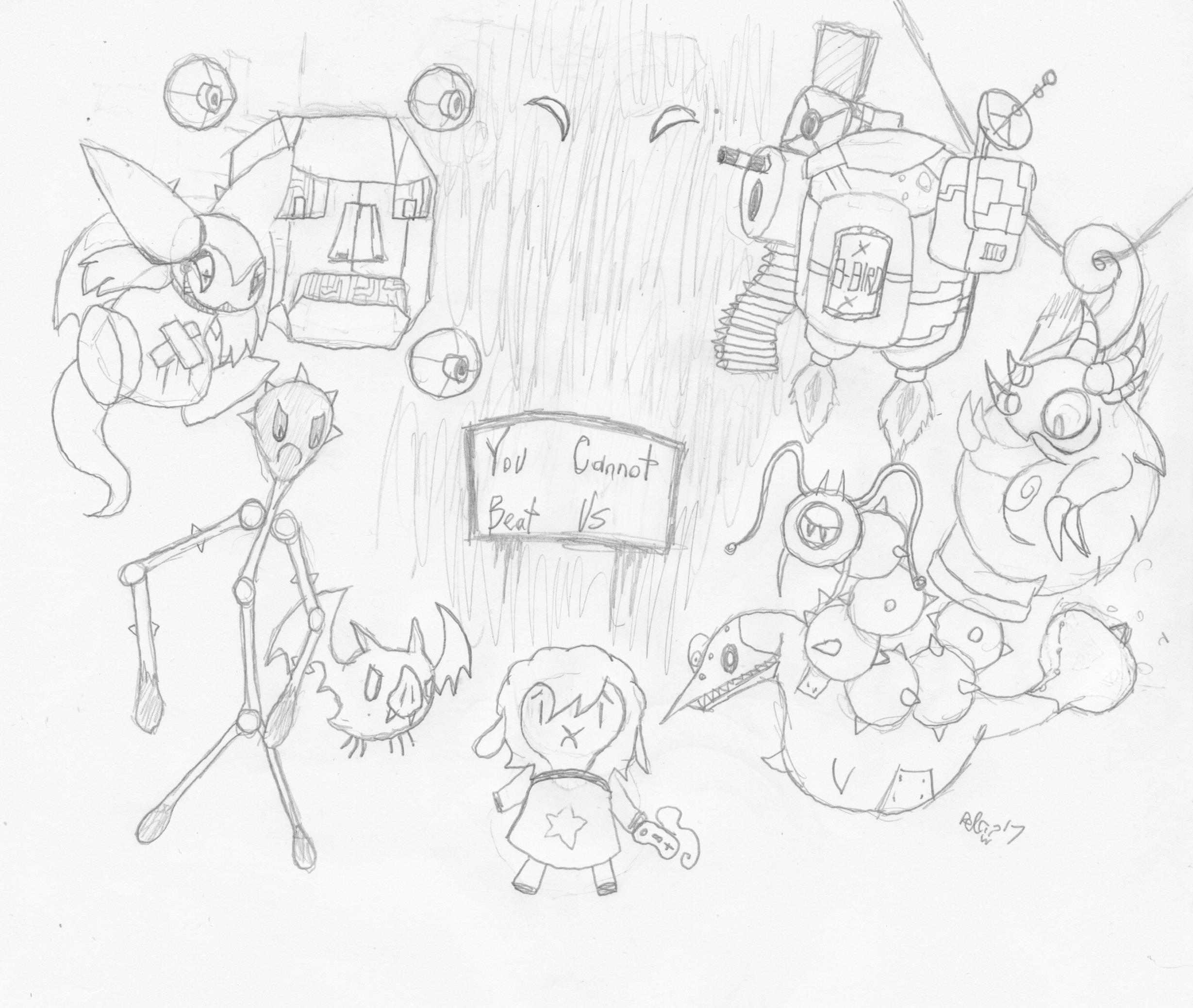 Bosses from a videogame in an RP I'm doing with my boyfriend, and his character Cosmo stuck in the middle of them.