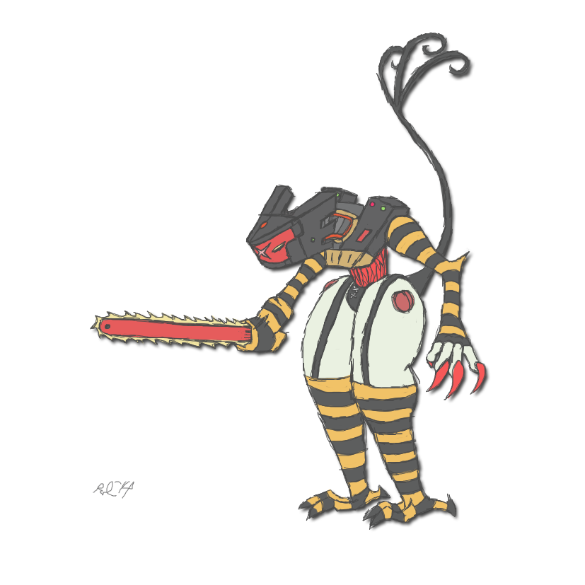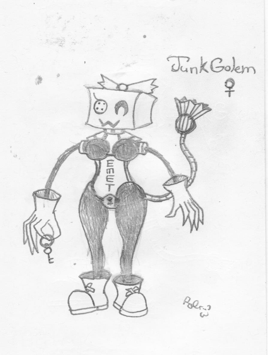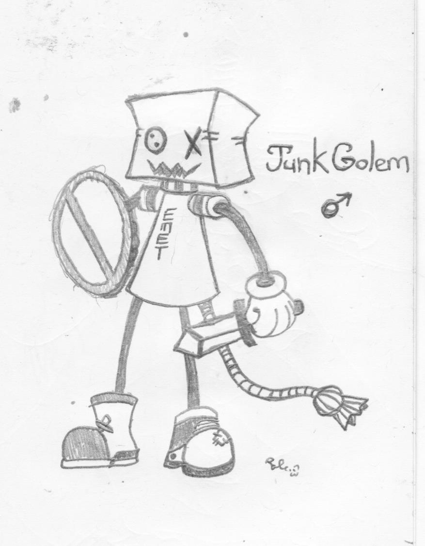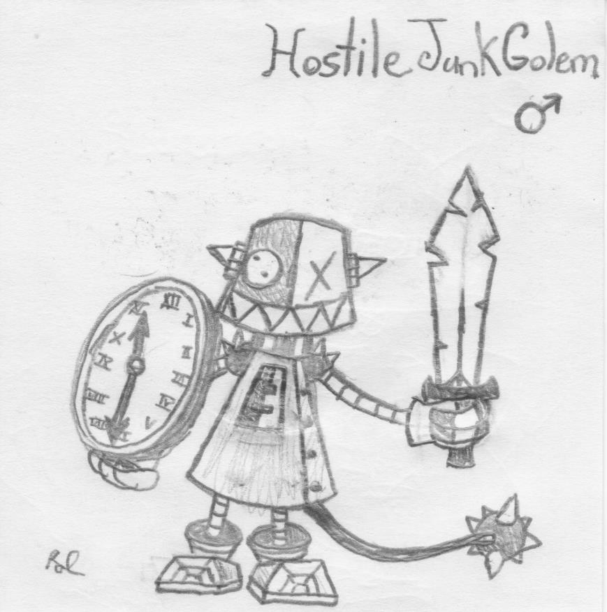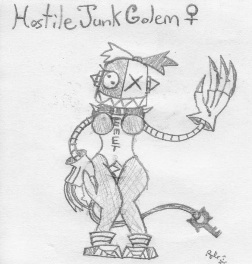 Hostile Junk Golem (Female): Considered far more sadistic and dangerous than even the males, the females of the Hostile Junk Golems have the same ability to build new Golems like their tame counterparts, but are also much more aggressive and prone to extreme violence. They specialize in climbing onto ceilings and surprising enemies, the same electric charge that powers the males used as a way to stun the enemy and leave them open to be torn apart by the bladelike claws. Because their hands are usually full of gore or flesh from battle, these golems weld their keys to their tails rather than carry them.