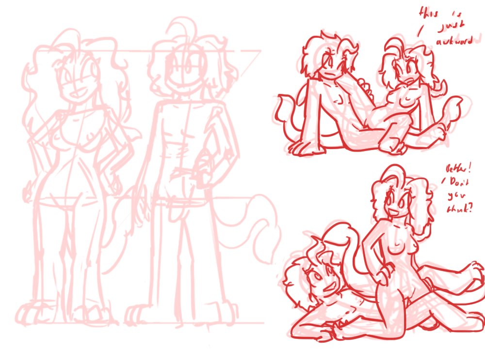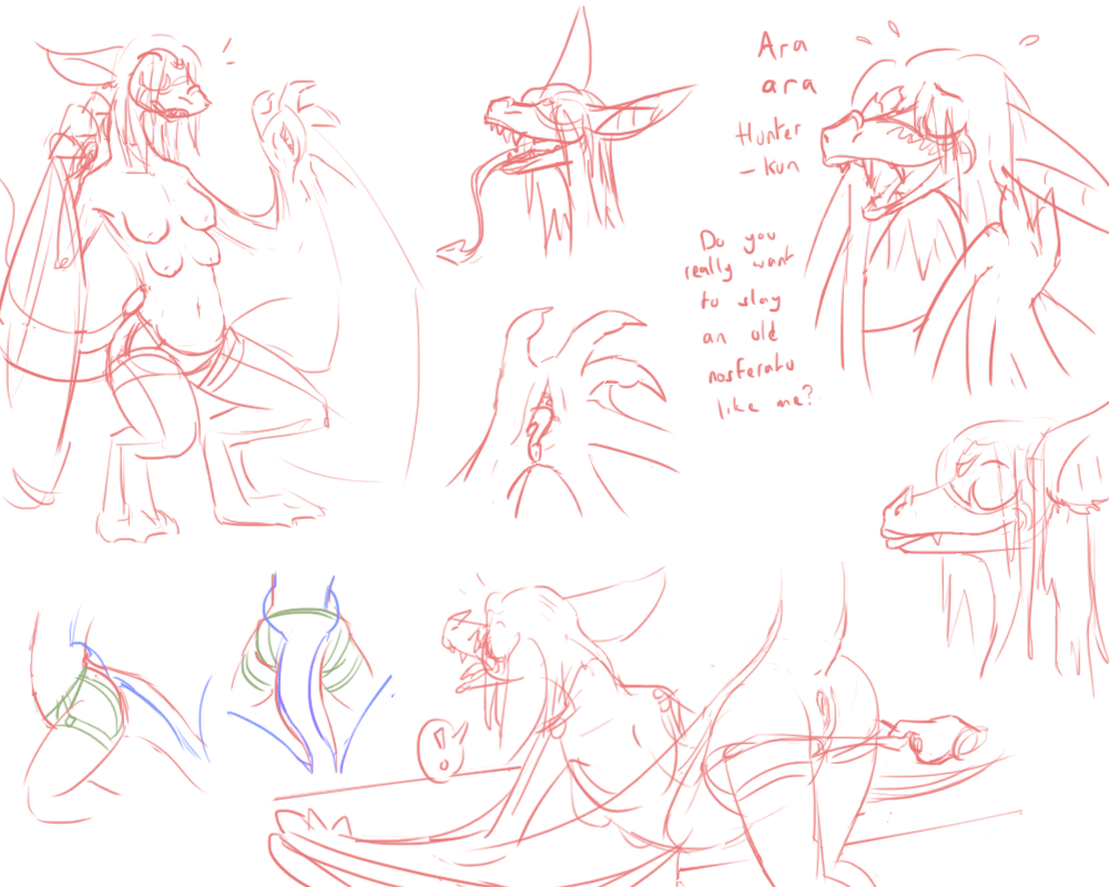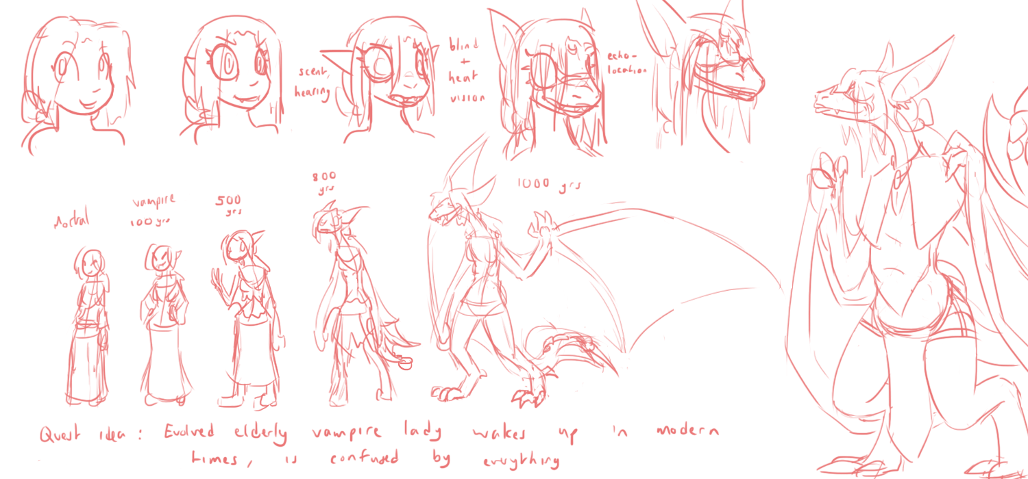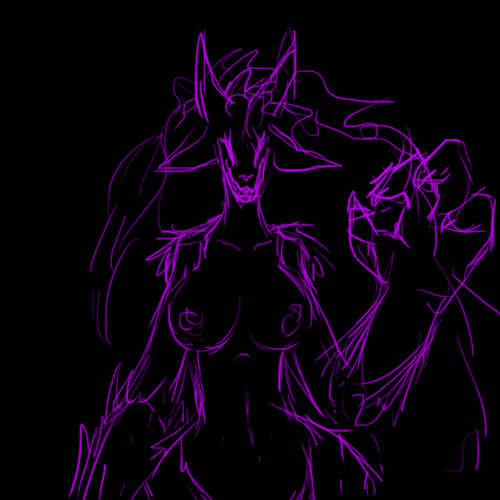Here's an image of our lust demon, as an example, and the effects of upgrading their stats. Starting off with a Lust demon, their Lust rating represents the demonic Charisma equivalent and grants them innate empathic/telepathic powers. They'd always need to have their Lust as their highest stat, but they can upgrade the others to gain those stats and abilities as well. It comes with a physical transformation, too. Lust (which also covers greed/gluttony) predisposes towards large hands and emphasis of the mouth/tongue, as well as the obvious sexual characteristics. With Wrath you get huge and swole and spikes, Treachery your body gets fluid and malleable, Sloth you get armor plating and maybe some insect characteristics, Pride gives you height and fancy horns and holes in your body for your infernal flame to leak out (and they're all huge snobs so they dress fancy), Fear you get huge/extra eyes and ears, and Cruelty gets you longer, slender edge-like features with extra arms. All the types get a kind of innate magic ("helltech" is constructing/crafting-type abilities), and Pride and Cruelty also combine as the main stats you need for learned magic spells. The MP-equivalent is soul threads, that you generate by indulging in your Sins or by collecting them from the environment. They'd likely also be lesser currency in the demon world, where such a concept is recognized.