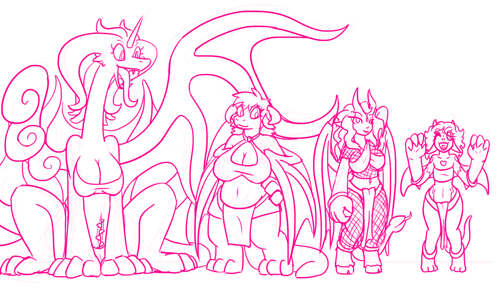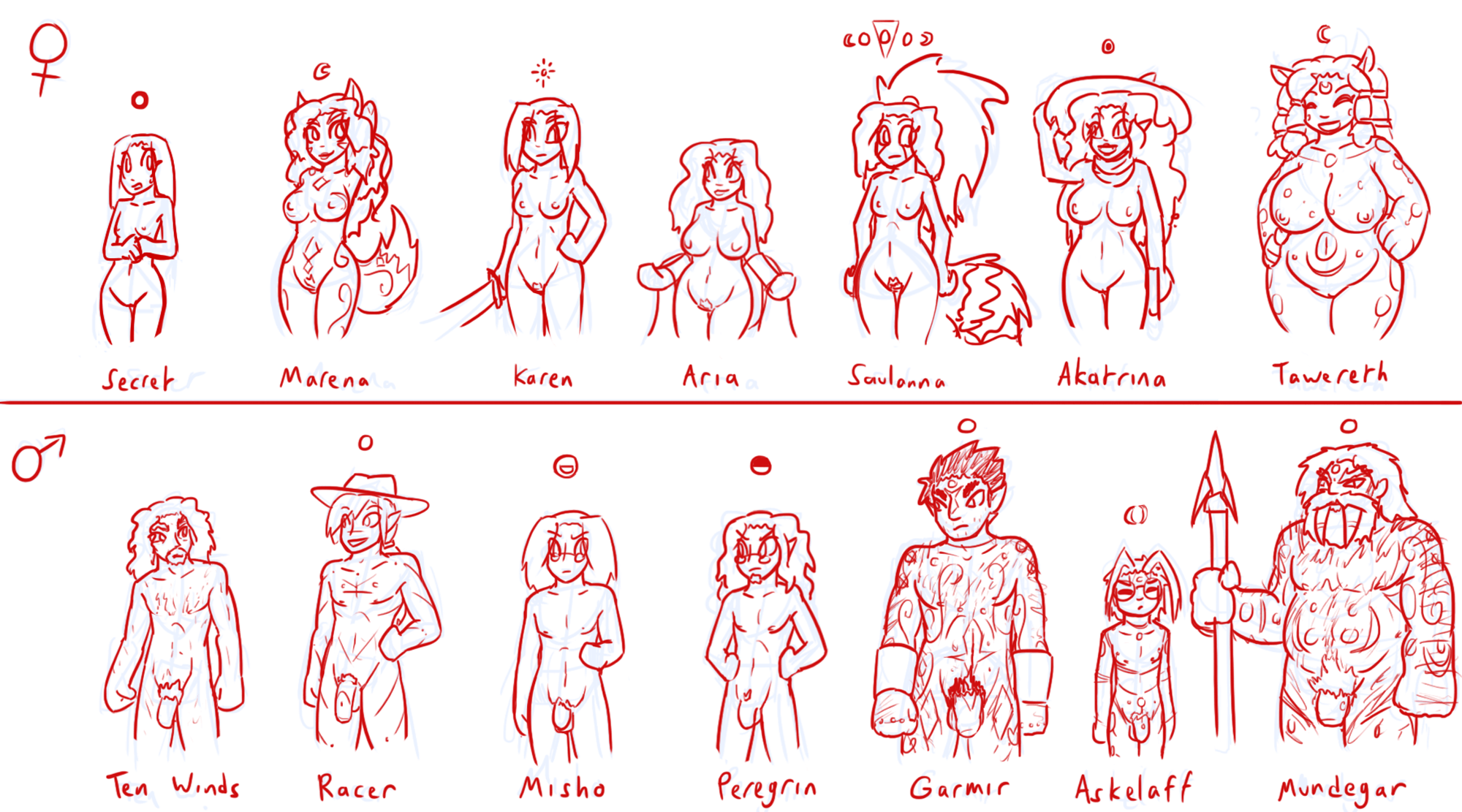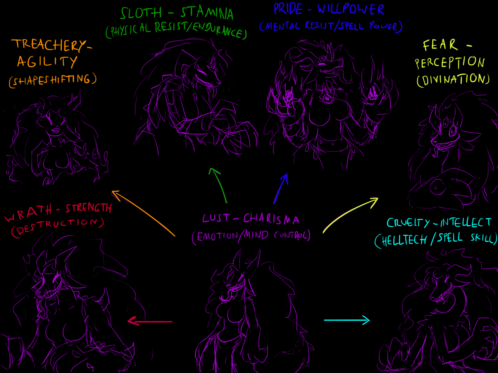 To make a little clarification, those aren't specific characters so much as they are examples of a type. The idea is a theoretical demon quest, where demons are loosely arranged into different breeds by their primary sin. There are Seven Sins, of course, though I adjusted them to make them more distinct and to line up with a sort of stat system.