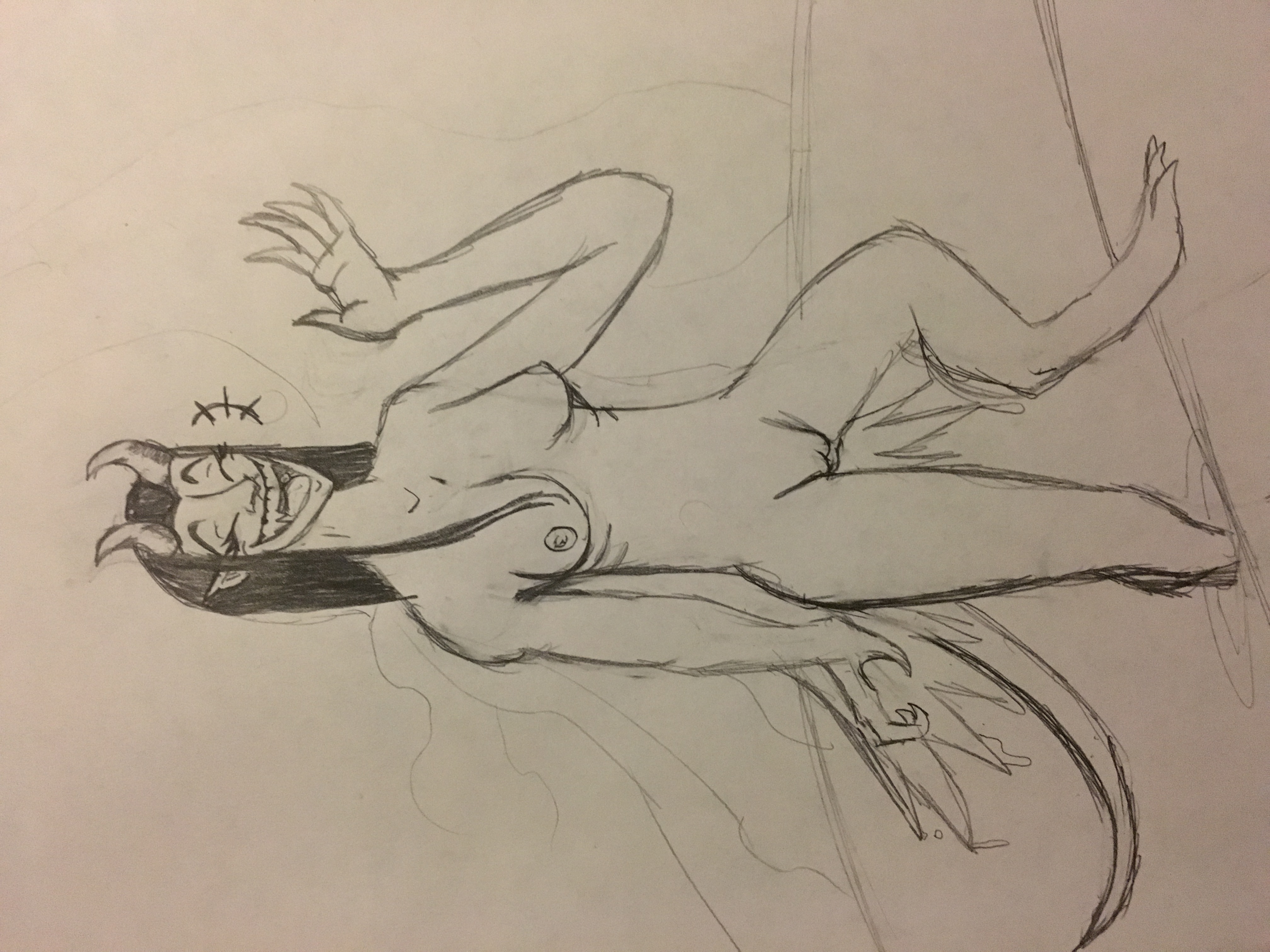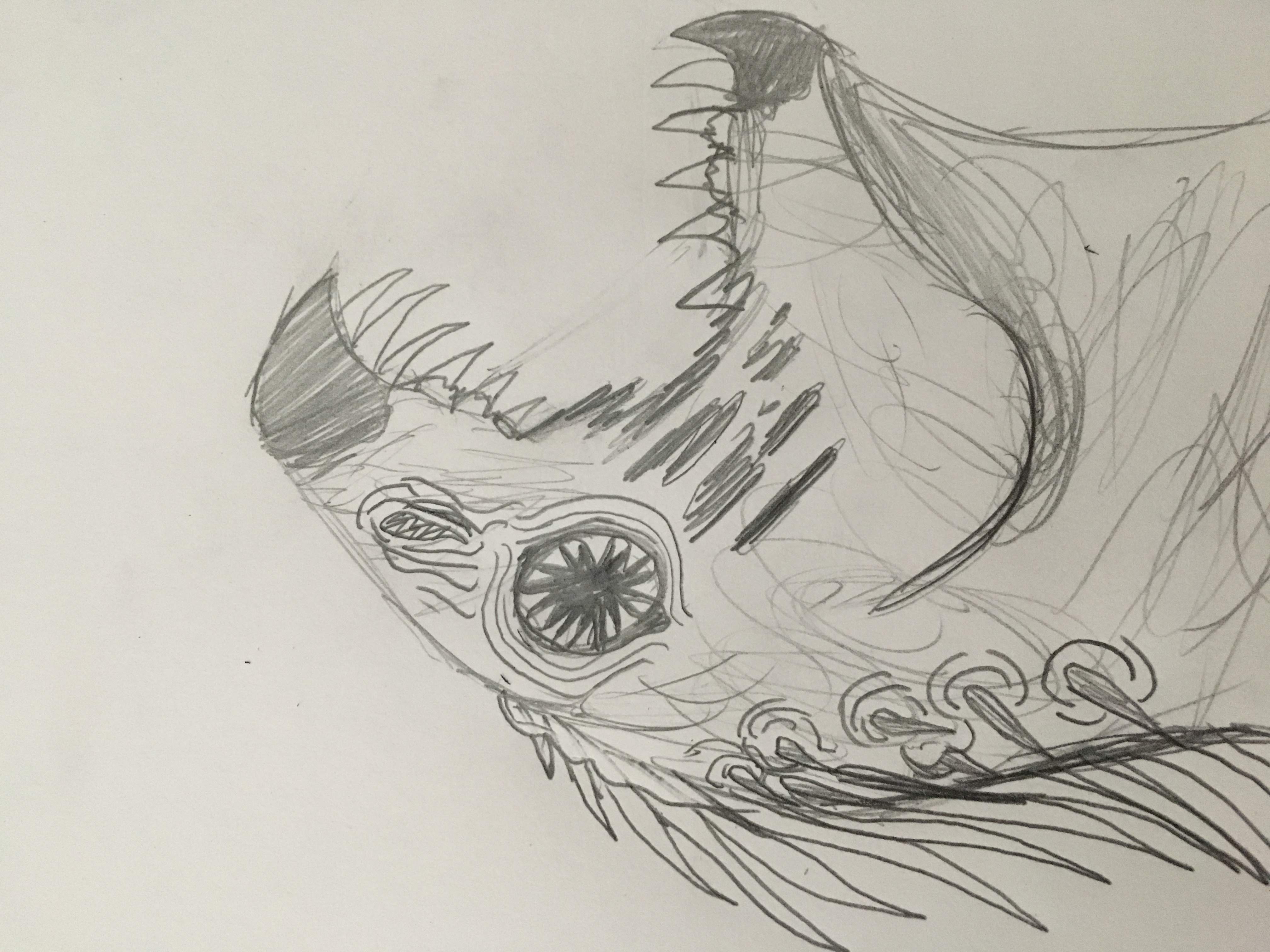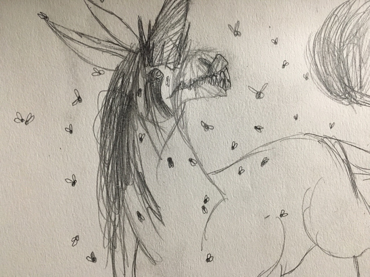 Her father’s face grew pale. “Get down! Get down!” He hissed, hiding behind a shop counter. She did as she was instructed. The trot of a horse grew closer, bringing with it the buzzing of a hundred flies. Cloven hooves clacked onto the cracked and broken linoleum tile. The creature scented the air, long ears flicking back and forth. The ink that poured down from its clouded eyes dripped down to the floor. A long tail ending in a tuft of dirty, matted hair. Its mane writhed with maggots, and a long, seemingly overgrown horn protruded from the center of its skull, closely followed by other smaller outcroppings. Its teeth were still covered in viscera, unfortunately old and dried on. The teeth themselves were long and jagged, almost as if they had grown out and broken at many different angles. A horrid stench surrounded it, akin to rotten meat and festering feces. It surveyed the abandoned convenience store, and after what seemed like an eternity of waiting, left. Emma opened her mouth to speak, but her father put a finger to his lips. They waited for thirty minutes. Finally, Blake lowered his hand.