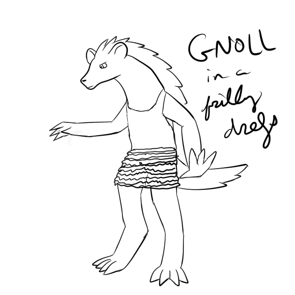 I STREAMED REQUESTS THINGS HAPPENED I DREW THEM PRETTY FAST AND WITHOUT THAT MUCH CARE FOR HOW THEY WERE TURNING OUT SO THEY'RE NOT WELL DRAWN First request was a gnoll in a frilly dress. A bunch of people requested this one.
