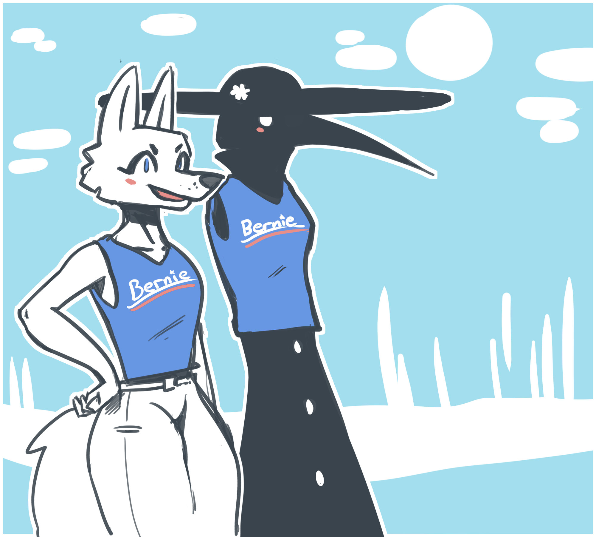 Eth and Mezz are both voting for Bernie Sanders in the Democratic Party Primaries - please join them if you can! It'd make them super happy! (Eth is a staunch republican, but she's voting bernie to trigger her lib friends. Mezz wants free healthcare since her employer provides none. Vote!)