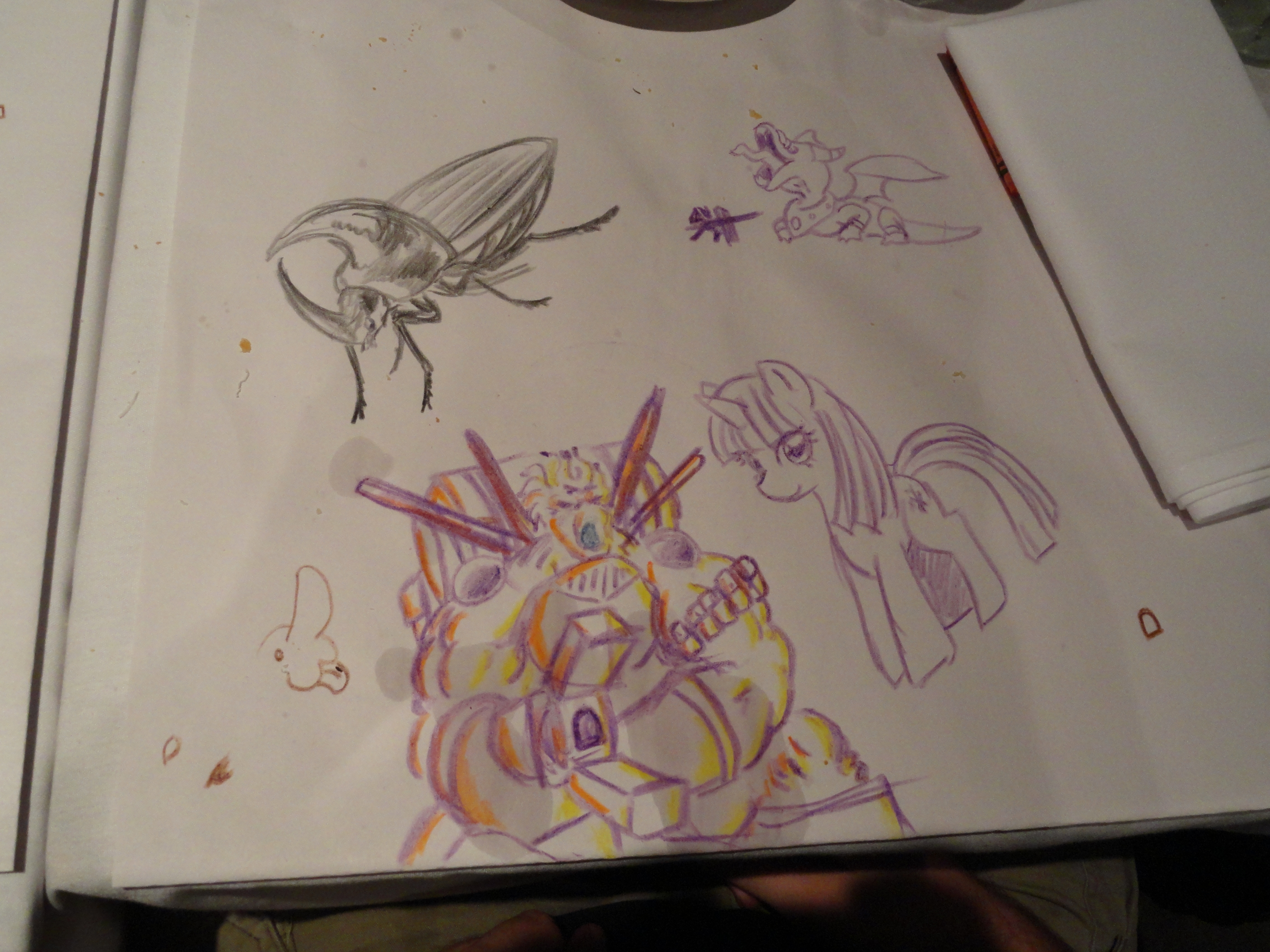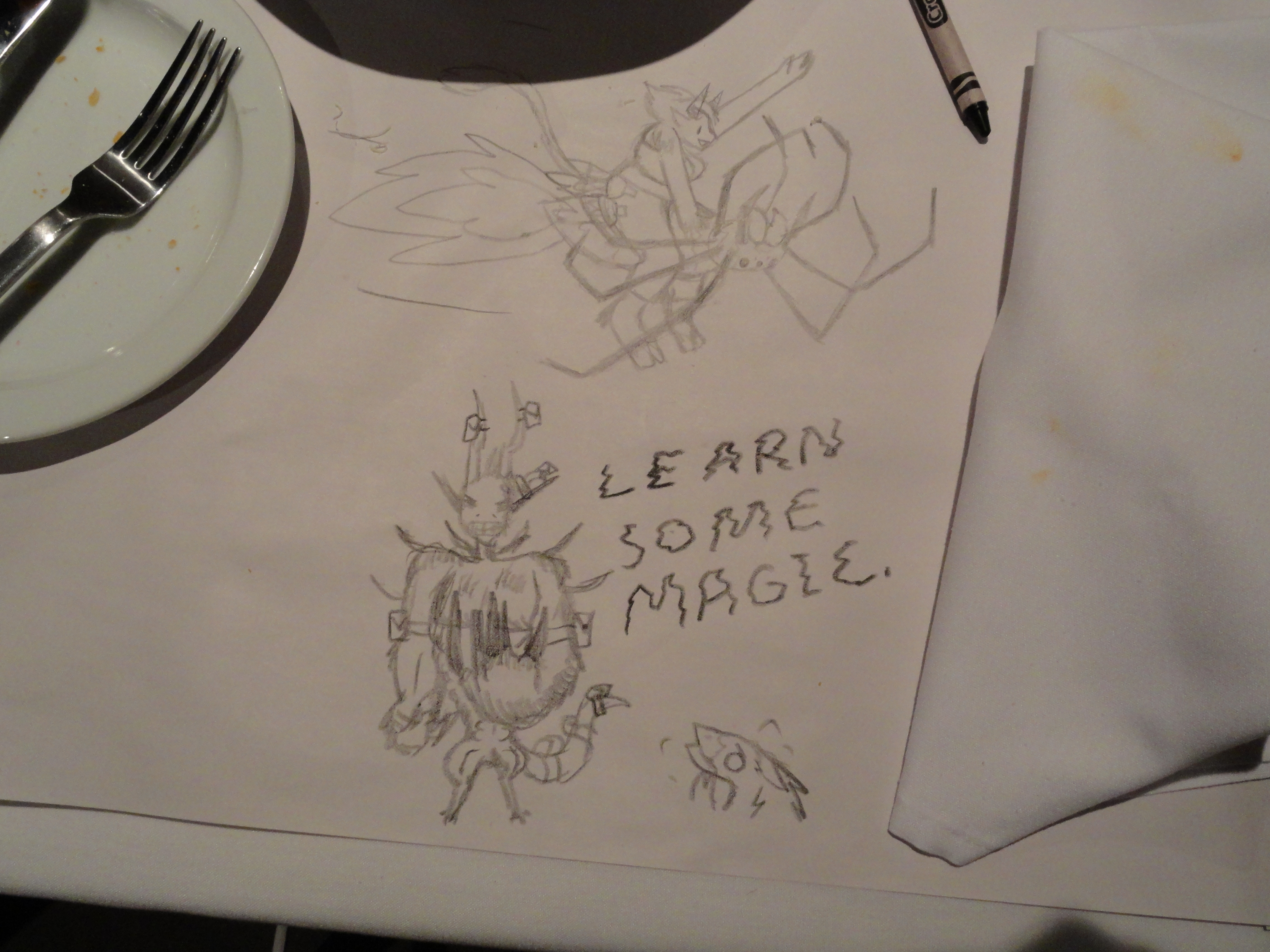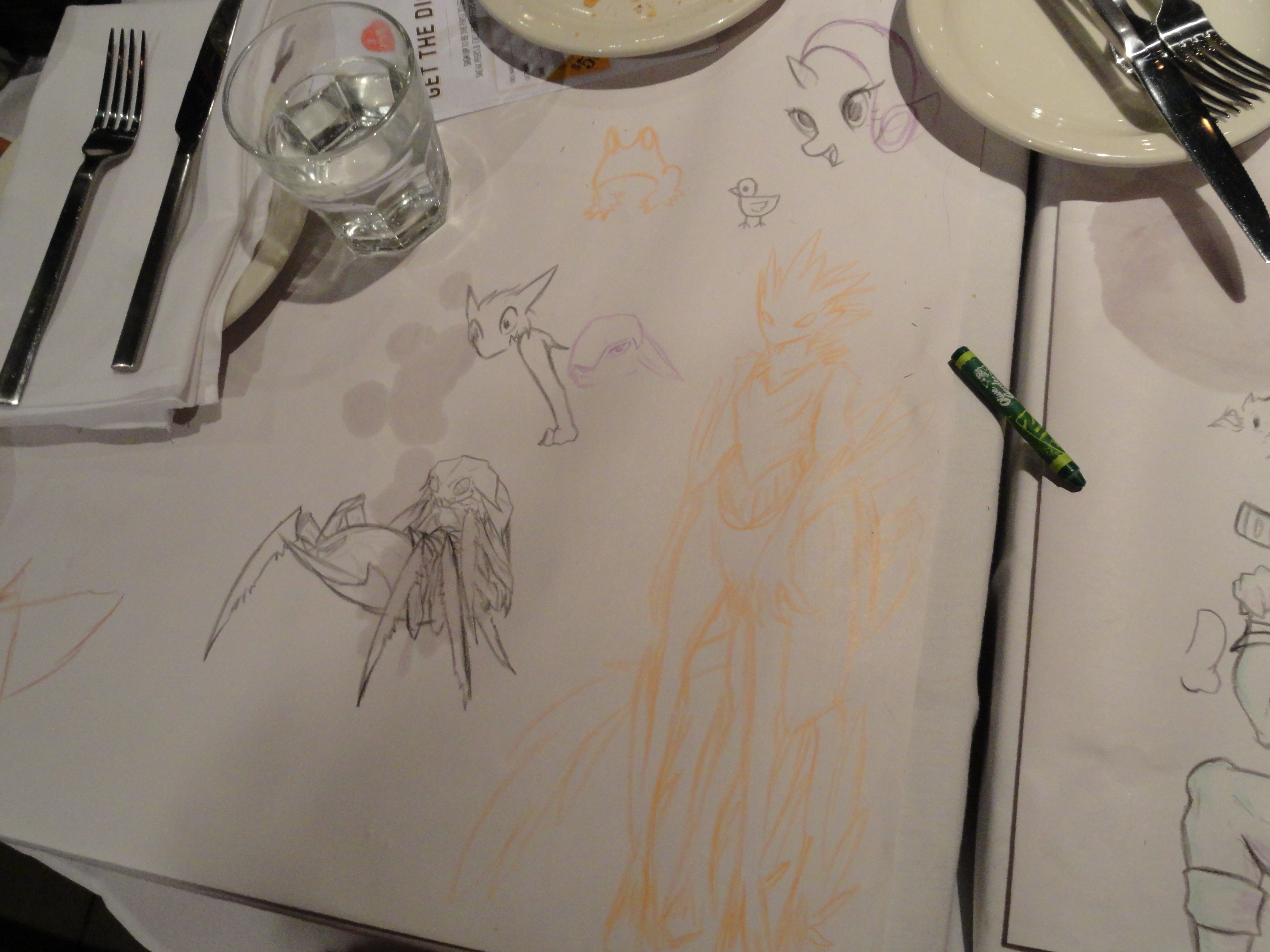 Photos of the table at Macaroni Grill, where we all ate fancy Italian food and drew crap. This is Capt. Slowpoke.
