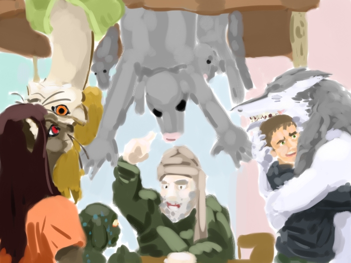 There's a sneaky elf, casually fiddling a knife; a beautiful human woman, dressed with slightly less than the rest; a hobgoblin with glasses, sitting at a table with some books; two young humans, a boy and a girl, twin siblings, standing next to each other; a tough, older half-elven man with a bare chest and armed with a scimitar; cheerful looking half-elven girl, a grumpy dwarf, a bit more thin and gaunt older human; and finally, sitting on a table in between the elf and the pretty human woman, looking like he is in charge: a kobold smoking a pipe, tough warrior-rogue type, with several small scars on his face.