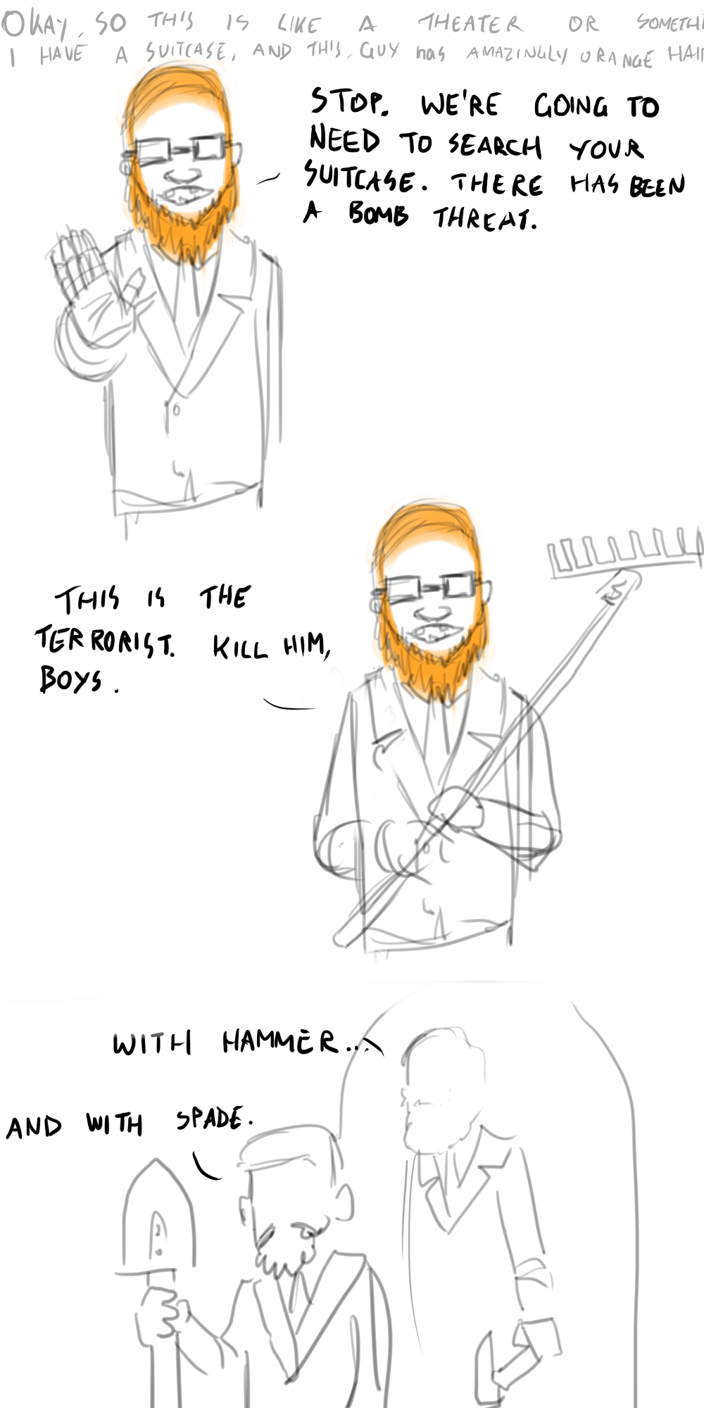 Okay, so I turned off my alarm last night, and I had one! Well, I probably always have dreams, but I never remember them. I only caught the end of this one. I can't stress enough how orange this dude's hair was.