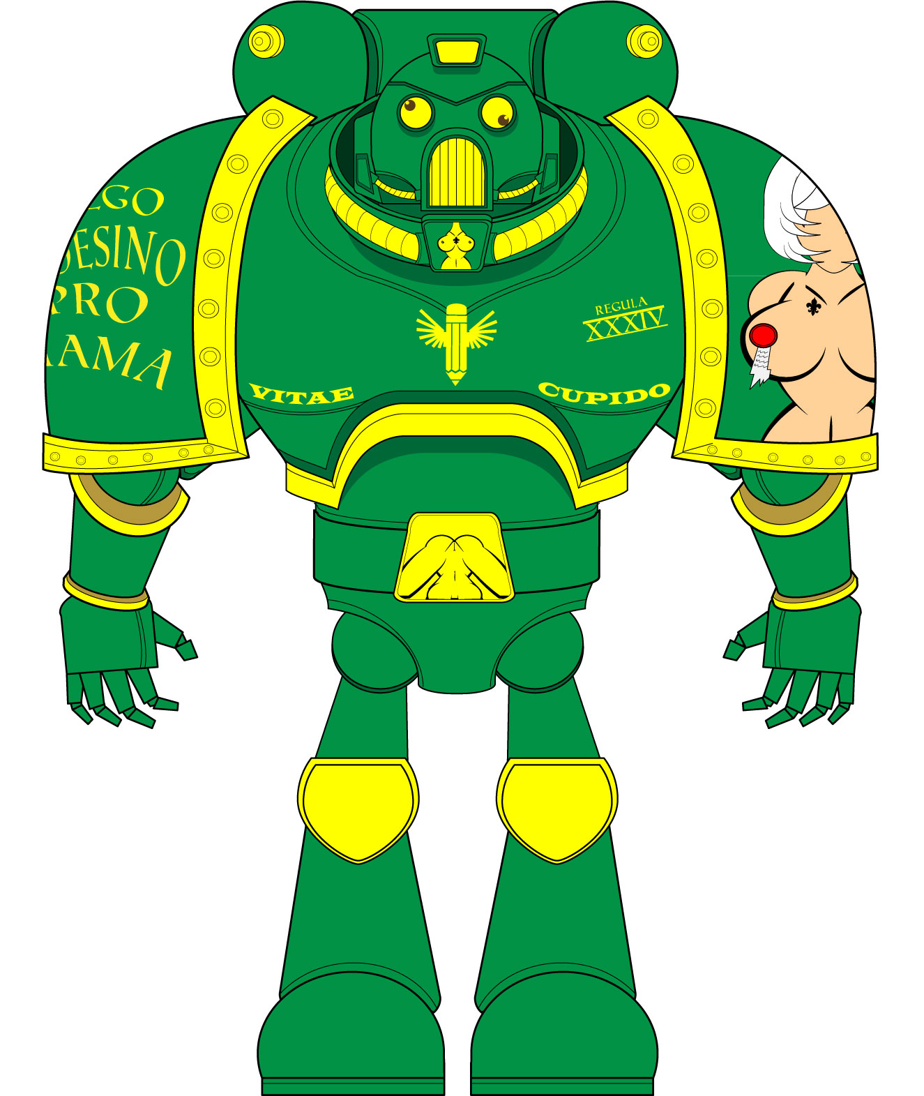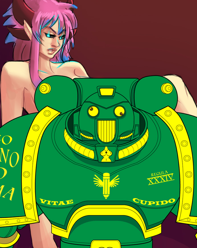 Hey greenmarine, is it safe to assume you know about the Primarchs Daughters writefagging? If not; alternate 40k 'verse, the Horus Heresy didn't happen, the Big E decided the Primarchs needed something to calm them the fuck down so he created them some daughters. Someone Else has been writing hundreds of pages of PD, mostly about Venus (Salamander) and Freya (Spess Voffs). The following text is how he described her cerminonial dress.