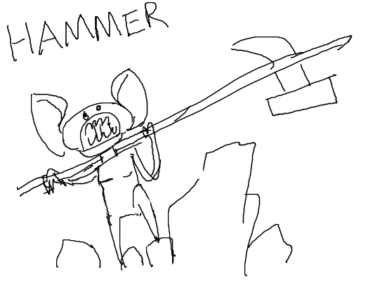 LOOKIT THIS HAMMER. LOOKIT HOW HUGE IT IS. IT'S HUGE! I KNOW HOW TO USE IT TOO. WHAT SHOULD I DO WITH THIS POWER? HAMMER POWER