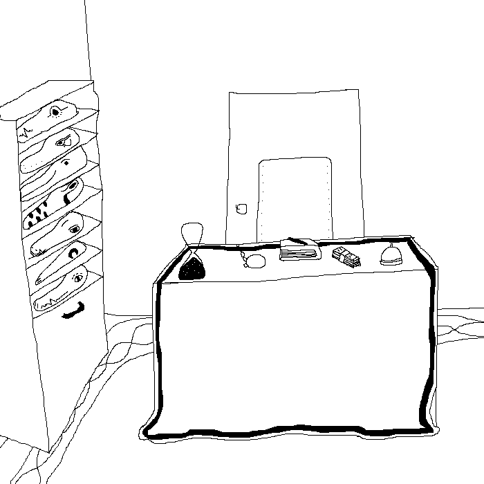 At long last, the precious JOB BOARD is found. There's a bunch of job applications, news articles, and other miscellanea pinned to it.