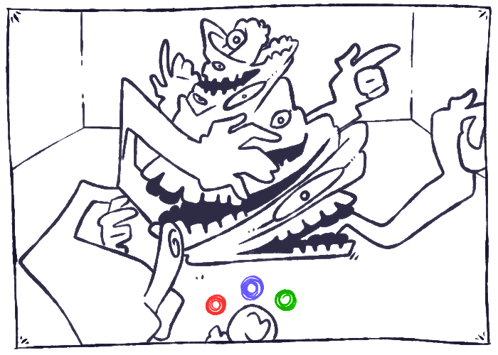 A hand reaches out from the darkness, and then another, and another. A form pulls itself around the corner, fingers digging into gaps between the heavy stone walls, mandibles chattering excitedly, body held high off of the bones you rest upon.