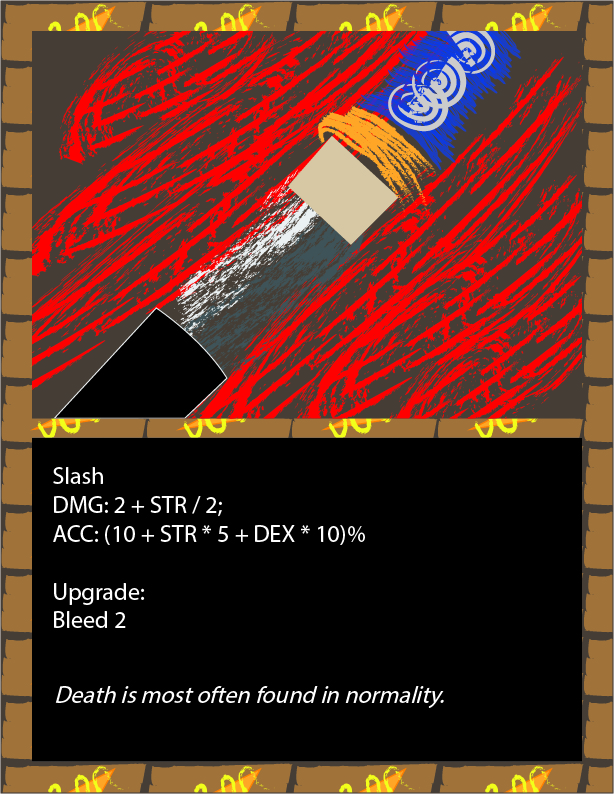 Bleed 2; //Causes opponent to lose HP each turn. Bleed 2 typically causes 2 damage for 3 rounds. Attacks that bleed will reset the bleed timer. Each turn, based on the target's remaining HP, Bleed has a chance to decrease in intensity or duration.