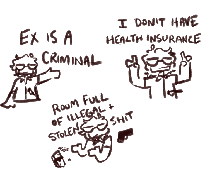 MERRITT is your best friend, your only ex you're on good terms with, and a skilled hitman. He could probably just give you stitches himself - he's good at shit like that. Only problem is, he's been living in bumfuck nowhere, an hour outside of Sentiment City (where you are). Something about the job he's been assigned. If you can find a stopgap solution to keep yourself from bleeding out in the meantime, he's probably your best bet for getting patched up discreetly.