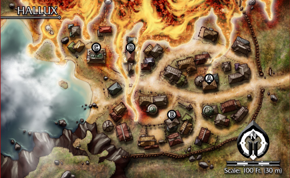 Your character has been staying in Hallux as far back as you can clearly remember, two or three days at least, and is currently at point C, caught between the glitched-out Volcano Tamer installation (level 5) and six angry magma weasels.